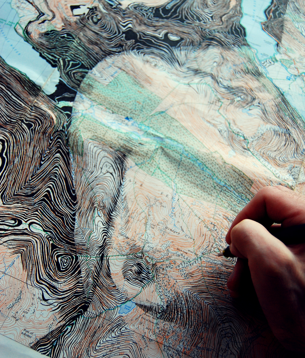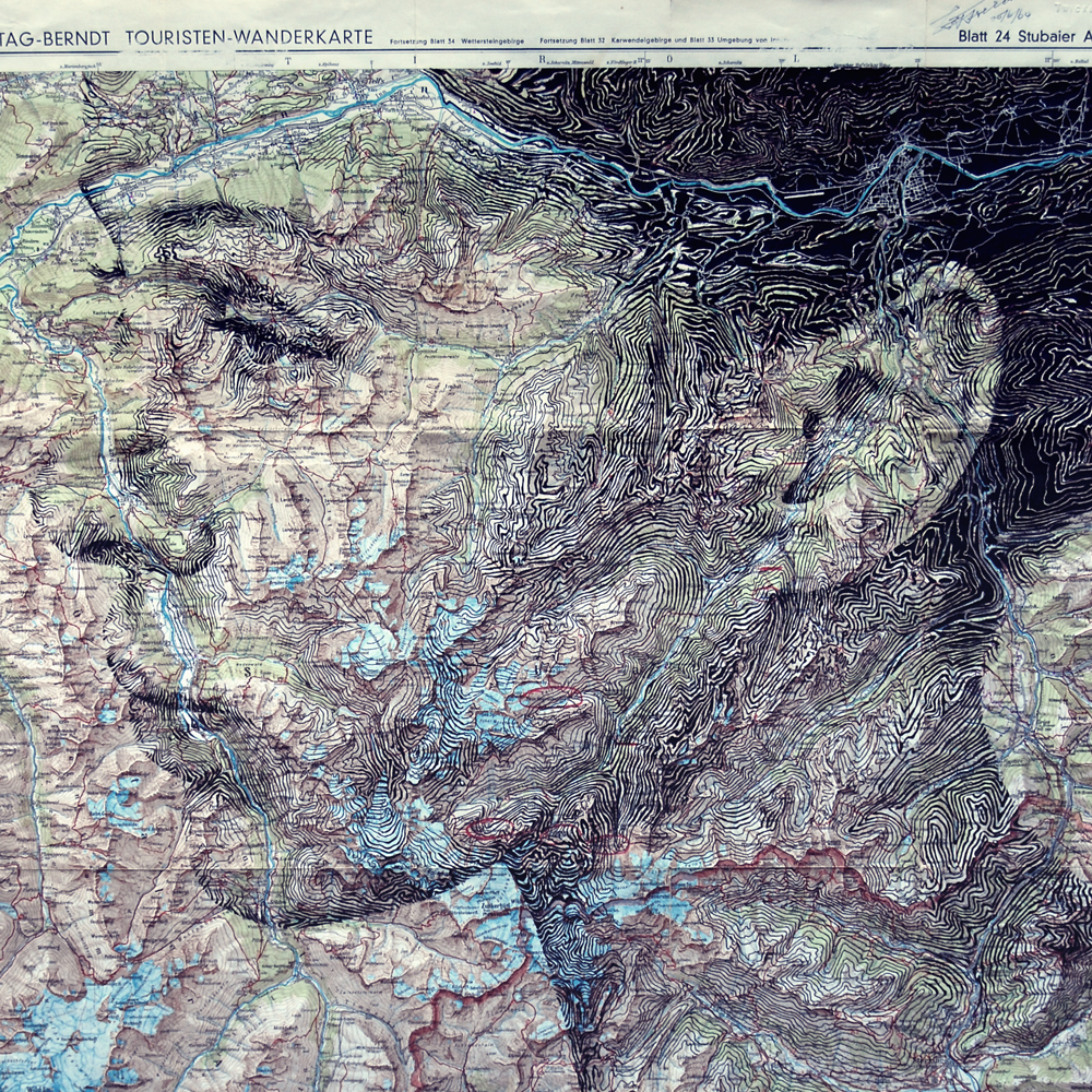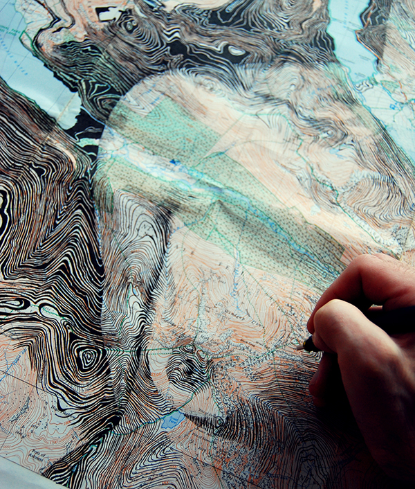 The parts I pick to draw over and around the landscape are, in relation to one another, the same ingredients laid upon the same composition as a portrait on white paper. It’s just that I find white paper uninteresting. So instead I utilize patterns, literally drawing upon the similarities that exist between us and those patterns—in the case of the majority of my work, what I find really interesting, those patterns are maps.
