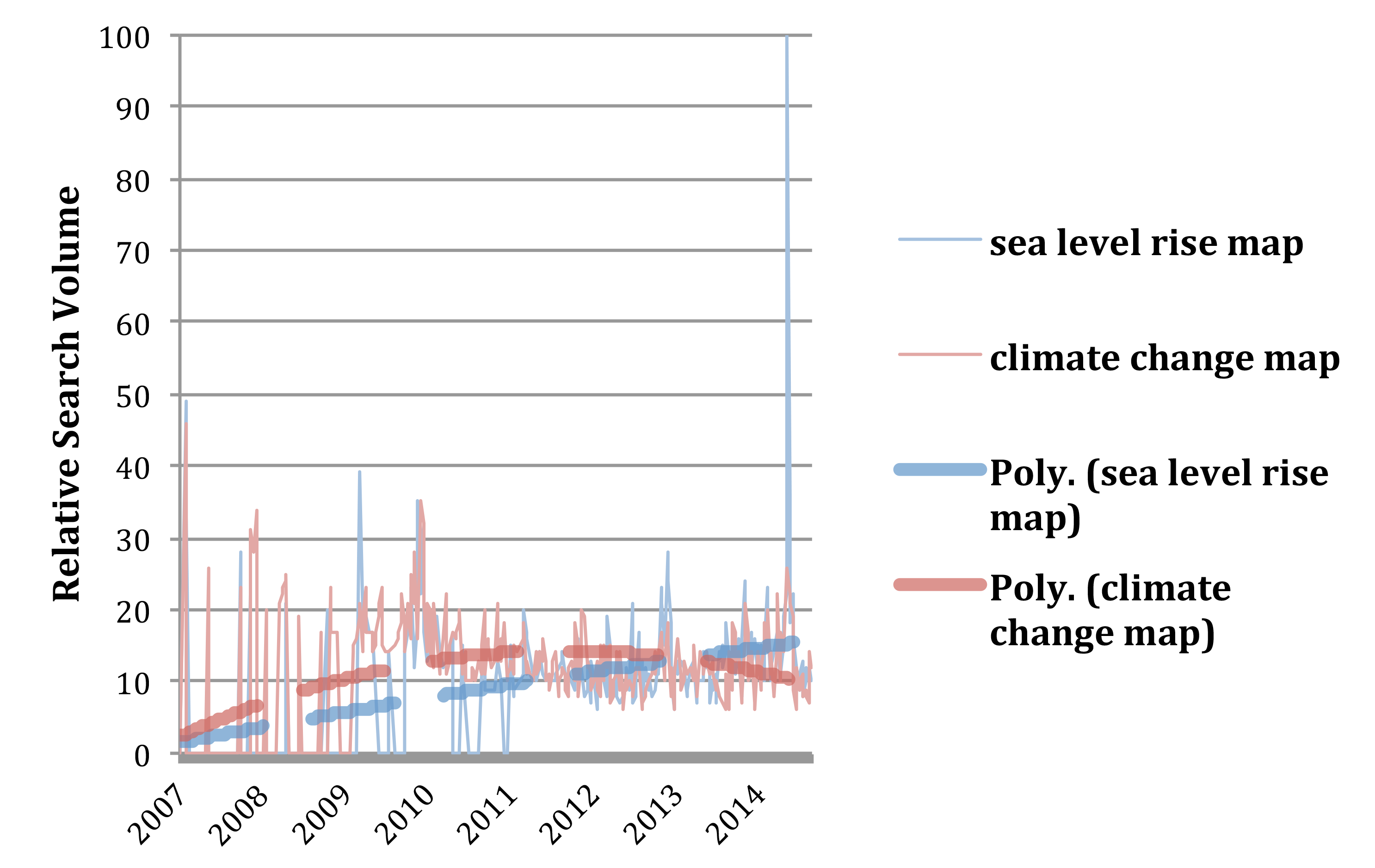 Figure 1: Weekly Google Trends comparison of the relative search volumes for the terms “sea level rise map” and “climate change map,” including second degree polynomial trend lines. A score of 100 indicate the highest search volume in the dataset. Search volumes for sea level rise maps have been increasing, and recently spiked to more than twice their previous highest value. This spike may have been driven by increased interest in sea level rise following widespread media coverage of a study predicting the collapse of part of the West Antarctic Ice Sheet (Joughin et al. 2014).