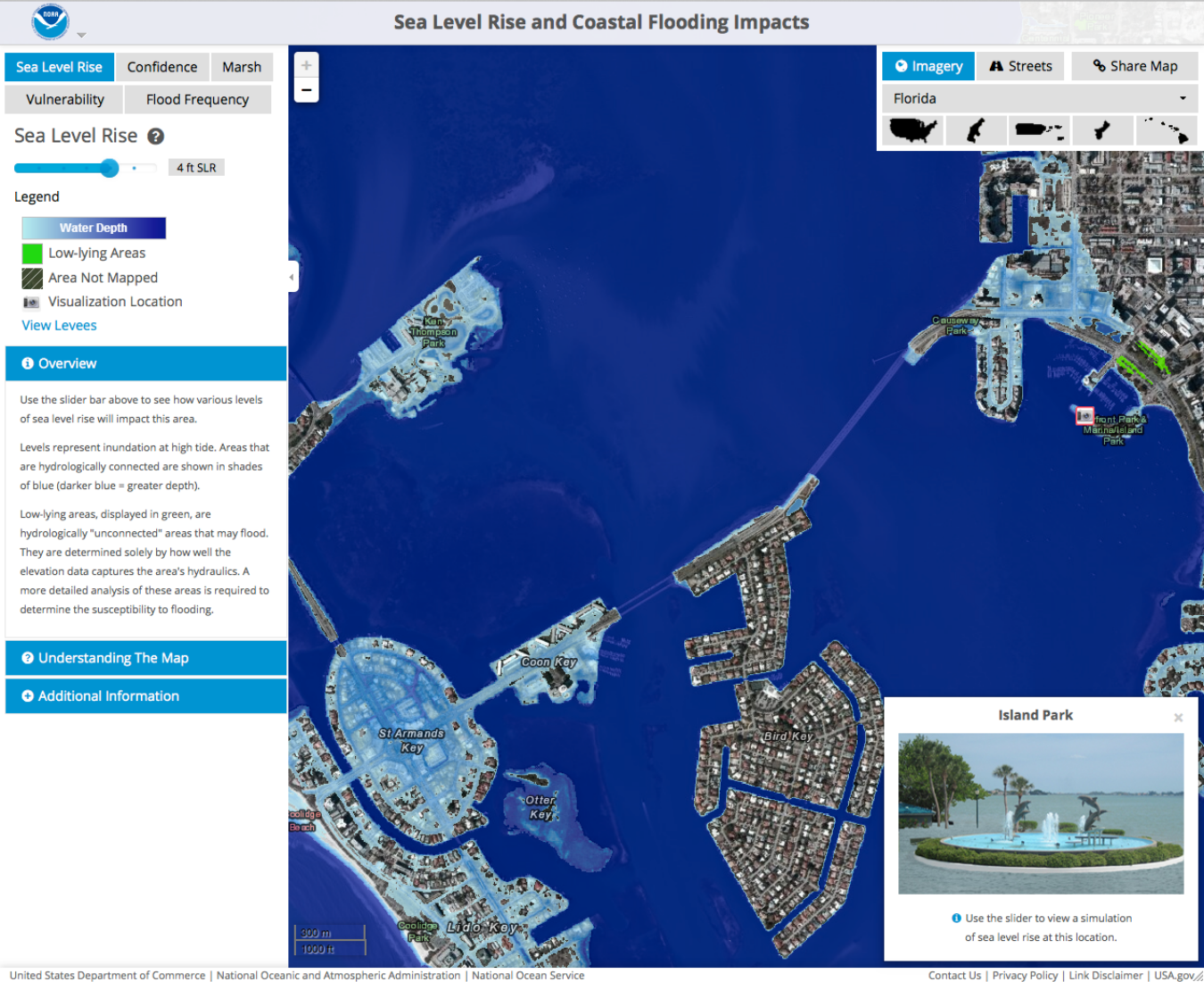 Several features of online sea level rise maps may diminish this discounting. To illustrate these features, this paper uses two of the more popular examples of online sea level rise maps: NOAA’s Sea Level Rise and Coastal Flooding Impacts Viewer (coast.noaa.gov/digitalcoast/tools/slr, Figure 2) and Climate Central’s Surging Seas (sealevel.climatecentral.org, Figure 3). First, these maps make sea level rise local, displaying it at the level of neighborhoods and city blocks, and making clear that—at least for residents of coastal areas—the sea level rise hazard is one that will likely strike close to home. This perspective casts sea level rise as a potential threat to one’s identity as a member of the local community, potentially discouraging discounting and weakening the role of broader political and cultural commitments in shaping beliefs about climate change (Kahan et al. 2013). Monmonier (2008, 67) predicted the power of such a local perspective, claiming that large-scale maps that show sea level rise on top of local road networks “could be a powerful message for coastal residents,” particularly if published in an interactive, online format. Second, the maps make sea level rise tangible. For example, the NOAA map displays not only the extent of inundated land, but also provides clickable placemarks that use pictures to simulate what sea level rise flooding might look like at several local landmarks. Similarly, the Climate Central map shows the locations of local schools, police stations, and other critical infrastructure that may be threatened by sea level rise. These depictions of flooding of well-known places make clearly visible the effects of climate change, which are often diffuse, difficult to observe directly, and emerge only through analysis of trends and averages over large temporal and spatial scales (Hawkins and Sutton 2009; Moser 2010). Third, these online maps make sea level rise personally relevant. The pan-and-zoom interfaces encourage map users to explore and zoom in on locations that are personally meaningful, whether in their own hometowns, favorite vacation destinations, or places of symbolic importance. As argued by Bostrom et al. (2008), such interactive features can allow users to customize hazard maps to suit their needs and interests, facilitating personal engagement with the sea level rise information.