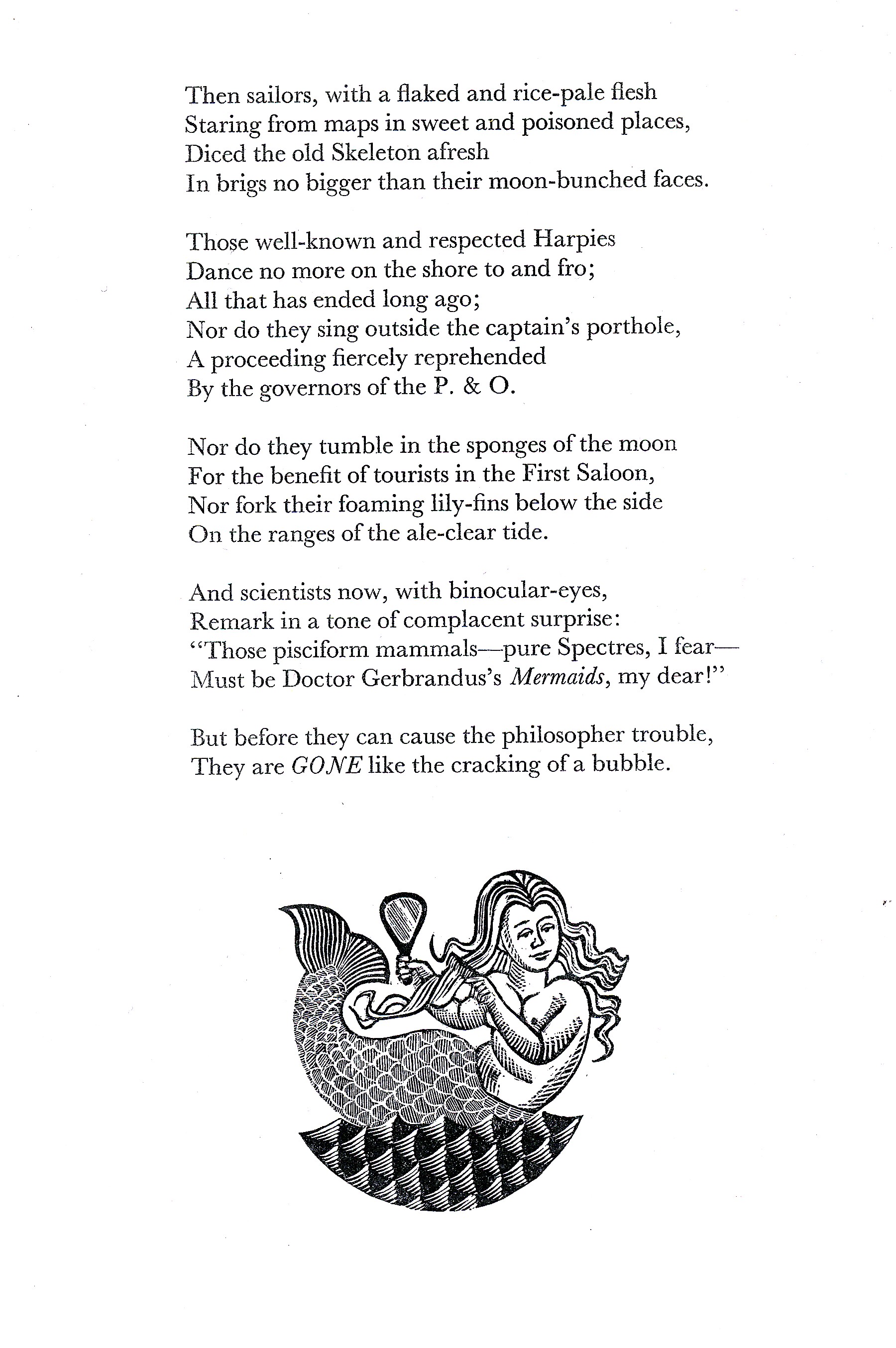 The difference between Cuckooz Contrey and the Australian poetry which had preceded it might be seen in … the change of outlook demonstrated in the subject of mermaids, where they are touched upon in “The Atlas.” To Hugh McCrae—and rightly for his purposes—a mermaid would have been a serious matter; Slessor drily notes that such an apparition would have hardly been credible to the passengers of the P. & O.