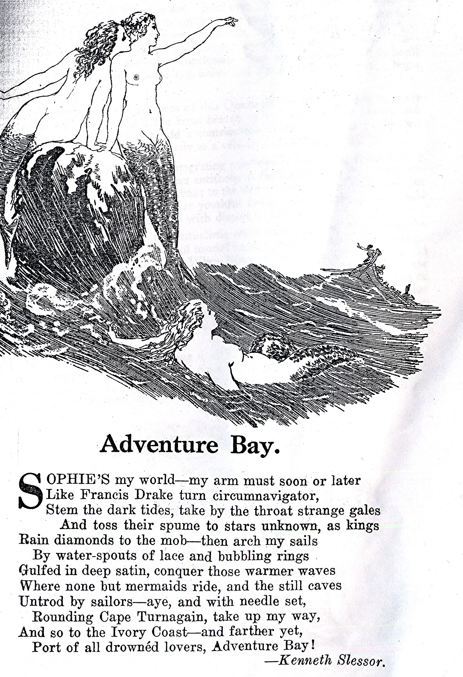 Figure 2. Kenneth Slessor’s “Adventure Bay” in Vision: A Literary Quarterly (November 1923, 6). For its debut publication, “Adventure Bay” was illustrated with Norman Lindsay’s enticing mermaids. Although Slessor’s lover/narrator desires to “conquer those warmer waves/ where none but mermaids ride” (lines 7–8), Lindsay also alludes to Odysseus’s temptation by the Sirens in Odyssey 12. Reproduced from Vision: A Literary Quarterly.
