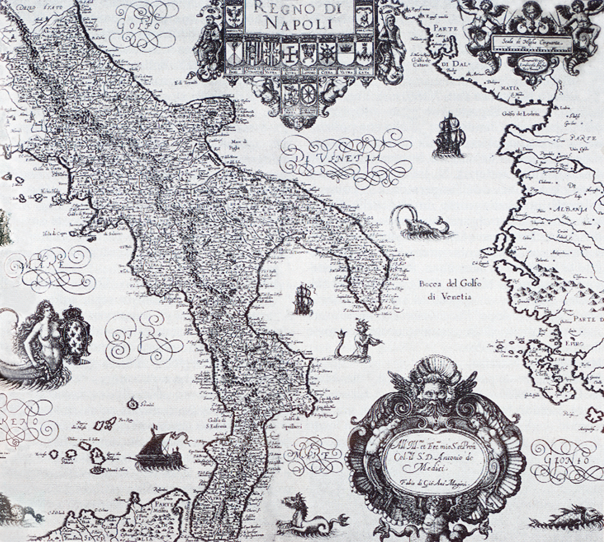 Figure 4. Giovanni Antonio Magini’s Regno di Napoli, pl. 48 in his atlas Italia, engraved by Benjamin Wright and published posthumously by Magini’s son Fabio (Bologna, 1620: 38 × 44 cm, 15 × 17 ¼ inches). Of the maps in Magini’s atlas that feature mermaids, this is the most ornate, displaying not only a mermaid and a piping merman in the sea, but also ships, sea-monsters, and a cupid merman on the cartouche. Regno di Napoli is not among the Magini maps listed separately for six shillings in Old Maps of the World (Francis Edwards 1929, 89, entry 301). Reproduced from Enciclopedia Bompiani, vol. 6 (Storia), Gruppo Editoriale Fabbri, Bompiani, Sonzogno, etas; Milan 1988. Posted on Wikimedia Commons and accessed March 26, 2015: commons.wikimedia.org/wiki/File:Kingdom_of_Naples.png.