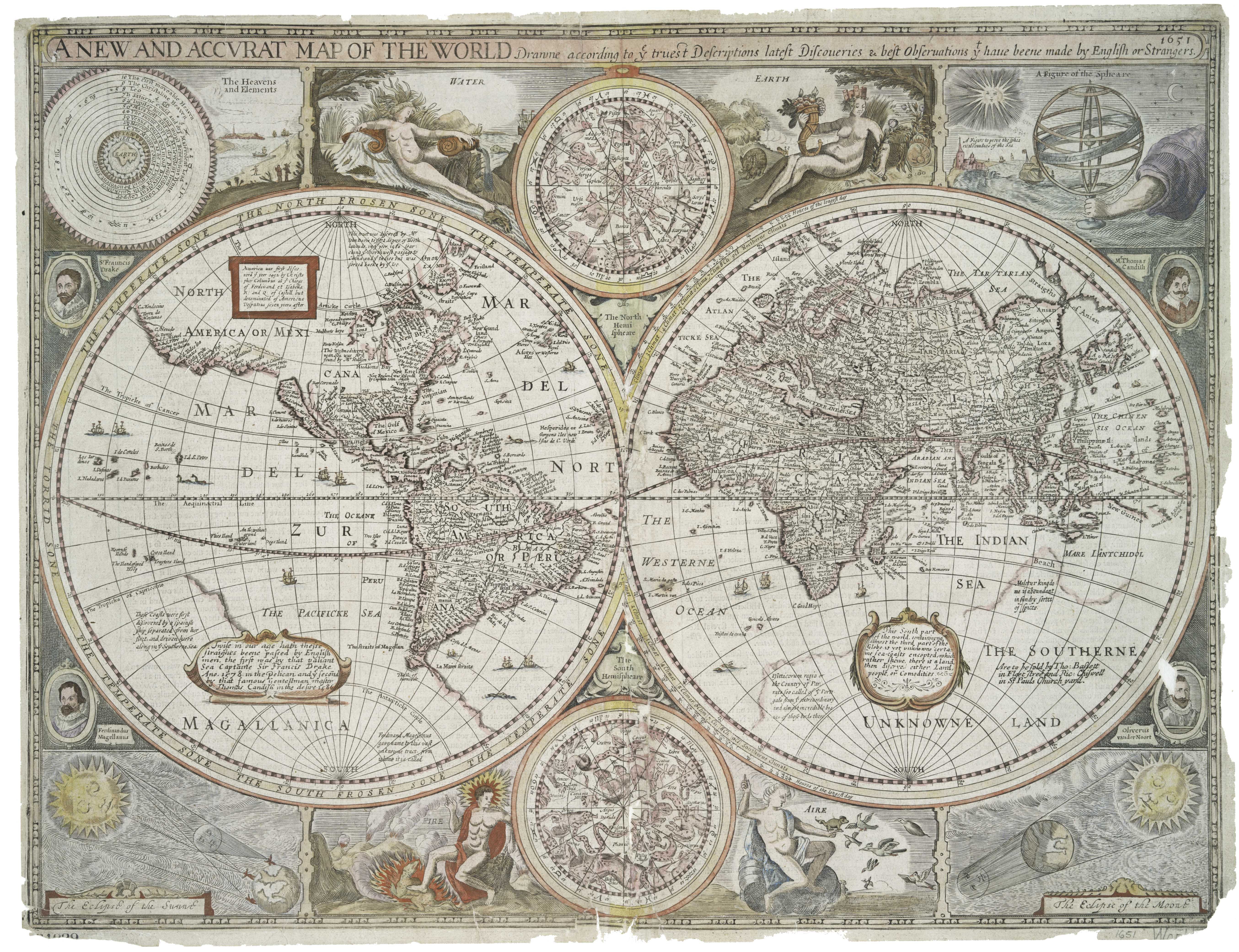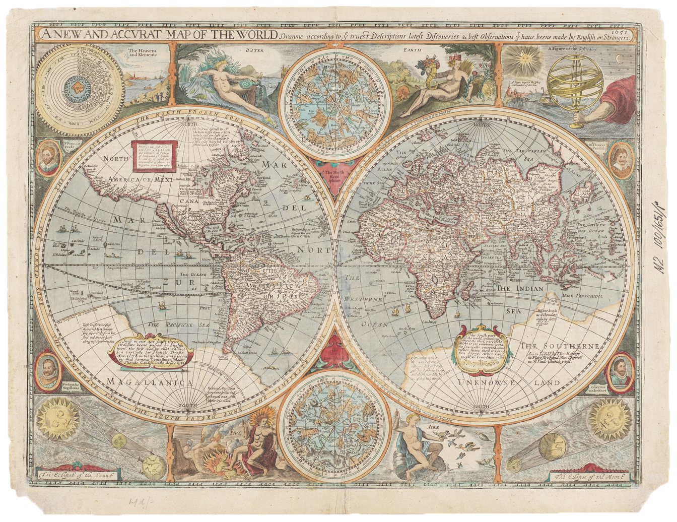 A New and Accurat Map of the World, in two Hemispheres, Western and Eastern, with the Heavens and Elements, a Figure of the Spheare, the Eclipse of the Sunne, the Eclipse of the Moon.”—J. Speed, 1676.