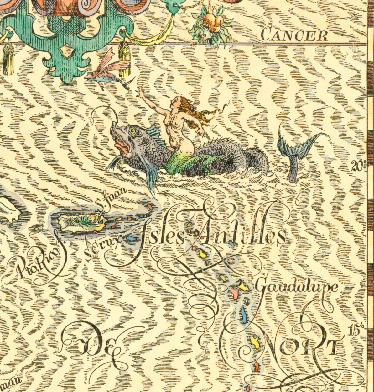 “Mermaids” may celebrate fanciful creatures, but maps are equally its subject. Besides the epigraph, two of the poem’s nine stanzas call attention to them. In stanza five “sailors … star[e] from maps in sweet and poisoned places.” And stanza three, added belatedly after Slessor had worked his way through the original five (June 30, -s168; July 3–4, -s170–171; July 6,-s173), focuses entirely on a type of map named only this once in The Atlas:
