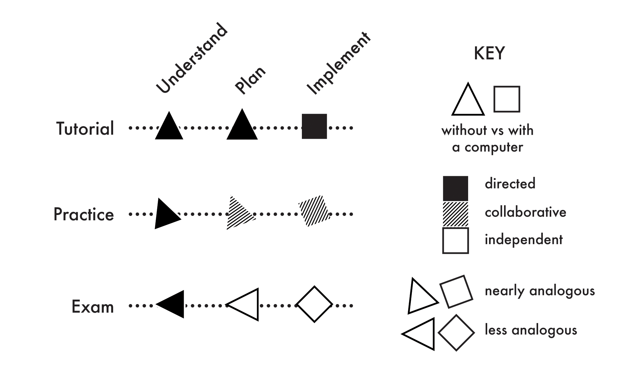The teaching model I currently use maintains two central components of Bob Churchill’s original model: (1) a worked-example method to introduce GIS tools to students in the context of solving geographic problems, and (2) task variability by presenting students nearly analogous practice problems following the introductory tutorial problem. The two major changes I made to this teaching model are (1) to present the worked example as three stages of problem solving, and (2) to present the software tutorial as a pre-lab assignment. Figure 2 illustrates the main components of the teaching model. The vertical axis shows the three types of problems presented to students (tutorial, practice, exam). The horizontal axis represents three phases of problem solving (understand, plan, implement). The tone of each shape represents fading in a social dimension from instructor-led (black) to collaborative (hatched) to independent (hollow). The orientation of each shape represents sequencing in a transfer dimension, or the degree to which the problem is analogous to the first problem, from nearly analogous with a slight twist (only a slight rotation) to a problem that involves a situation that is not analogous to a tutorial problem (a large rotation). Over the duration of the semester, instruction transitions from Tutorial to Practice at a weekly interval (each week, students solve both types of problems), repeating this pattern for several weeks before students attempt Exam problems during a staged take-home format.