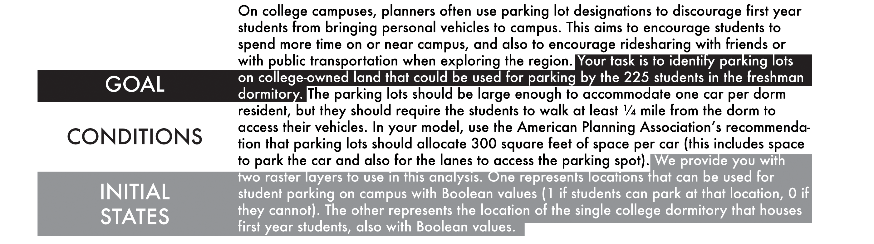 As Figure 2 indicates, the exam is again structured around three phases. The exam begins with a presentation of each problem by the instructor. I tend to draw schematic pictures of the problem’s conditions, helping students with this one part of understanding the problem in order to draw their attention to the key condition of the problem. I also provide students with pictures of the real datasets, including pictures of the metadata (cells size, extent, reference system, data schema, etc.). Students then have a period of time to develop plans for solving the problems. They are asked to complete a detailed workflow (input-operation-output diagrams) and detail all parameters for each operation that may affect the outputs. They are permitted to experiment with their plan using any of the data from the tutorials and practice problems from previous weeks, but do not have access to the exam datasets during this planning phase.