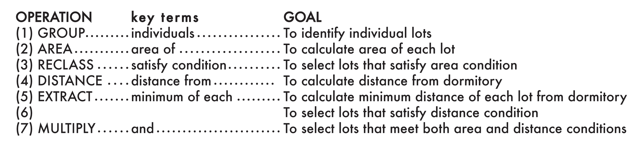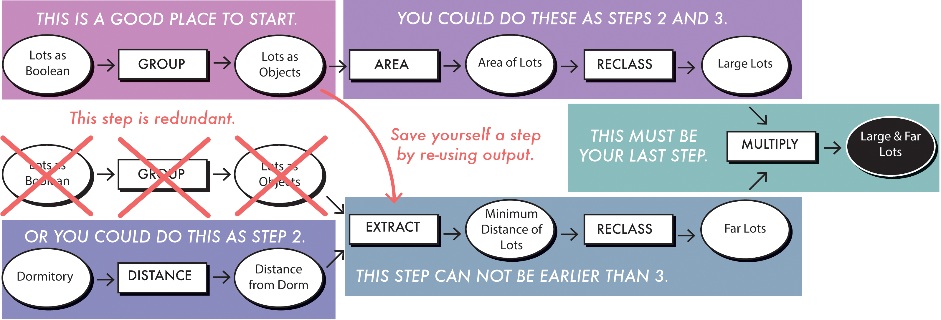 For the first objective, I first show students how to decompose the goal into a series of sub-tasks by focusing on telic (“in order to”) relations of goals (Figure 5a). For example, I ask, “In order to find lots that meet both area and distance conditions, what two things must we know first?” That should lead to two sub-tasks: find lots that satisfy area condition and find lots that satisfy distance condition. We continue this decomposition activity until we bottom at the initial states that were given to us. At this point, we reflect on the structure of the task hierarchy in order to recognize how sets of tasks suggest larger chunks of the procedure. In this example, we can connect three chunks of tasks to the three conditions visualized during problem representation.