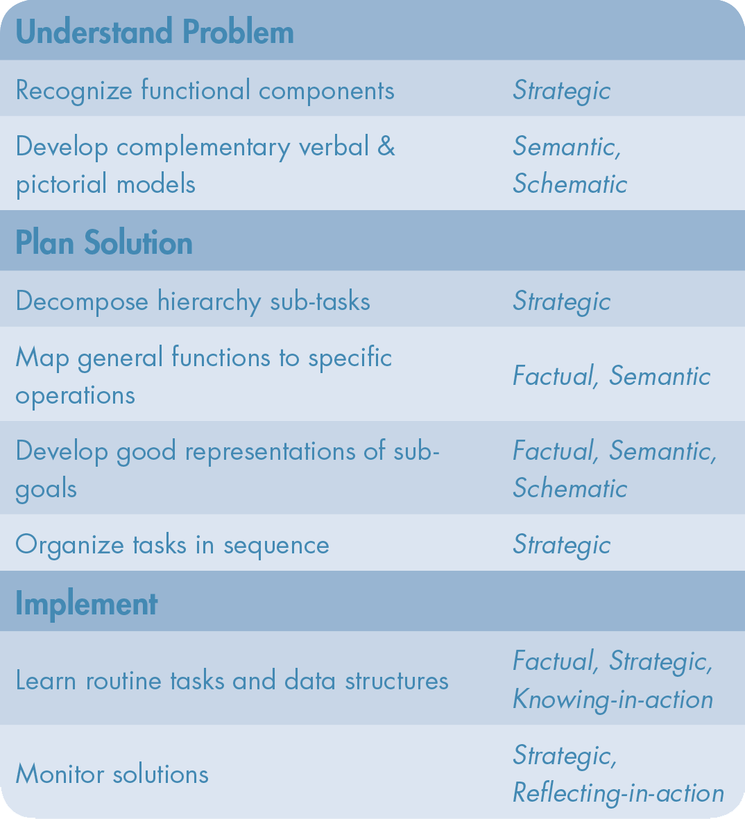 With respect to how we use knowledge, CLT posits that schemas held in long term memory can be processed in two ways. The first is unconscious processing, or something done without thinking and without placing load on working memory. In CLT, this process is called “schema automation” or “automatic processing.” This is distinct from “controlled processing,” which occurs in working memory and is characteristically slow, conscious, and limited (Schneider and Shiffrin 1977). Thus, although the jargon used to describe learning within a CLT framework fits easily with the acquisition metaphor of learning, it does not necessarily exclude the participation metaphor, or at least the kinds of knowing described by Schön (1983). Automatic processing bears similarity to knowing-in-action, as both involve knowing without thinking. Additionally, controlled processing seems similar to reflecting-in-action.