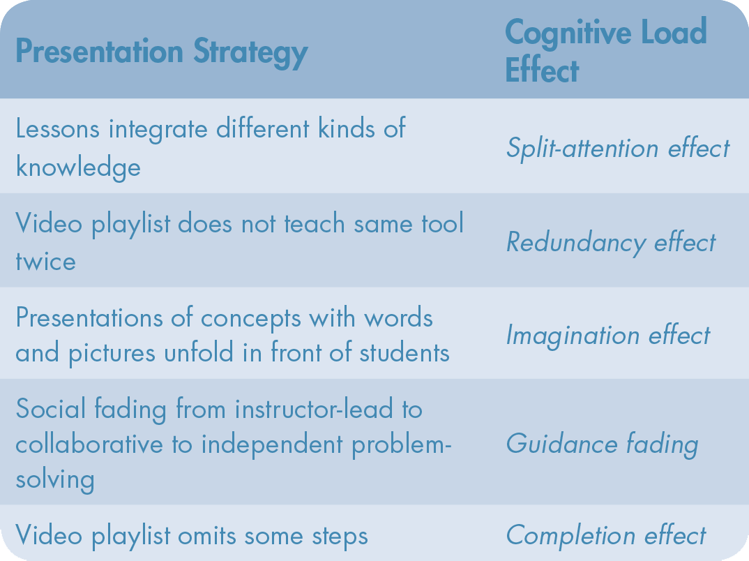 A common goal of research guided by CLT is to identify instructional strategies that minimize extraneous load on problem solvers in order to better enable the processing demands of intrinsic and germane loads. In CLT, these strategies are called “effects” because they have been empirically verified to affect learning outcomes.