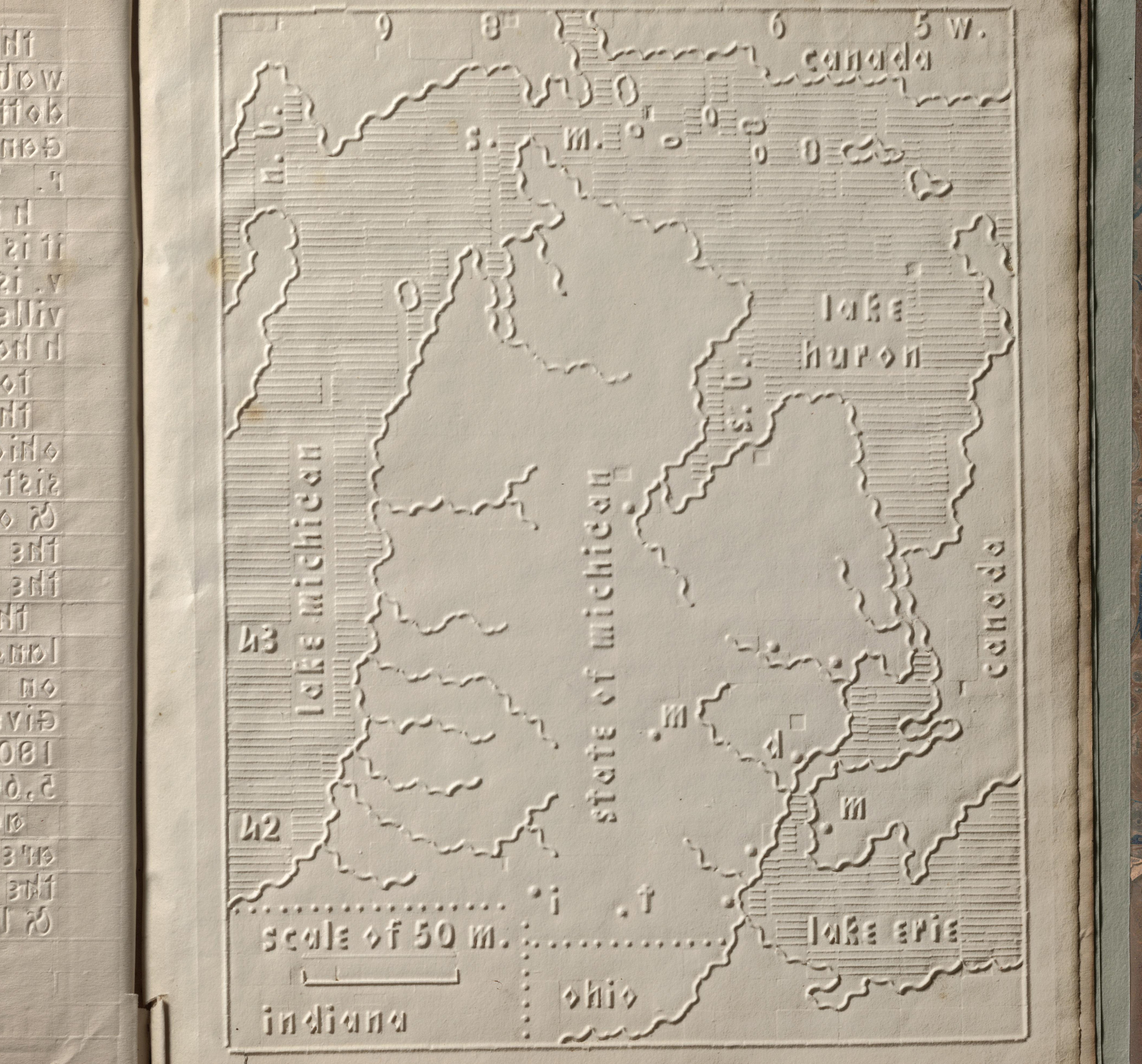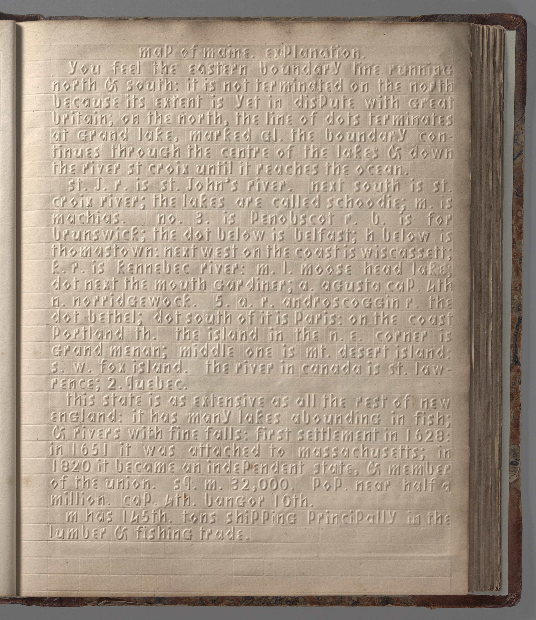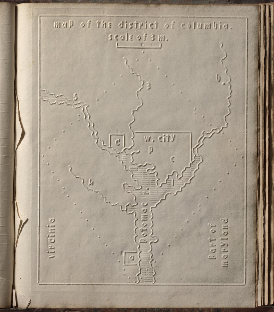 The Atlas of the United States Printed for the Use of the Blind was published in 1837 for children at the New England Institute for the Education of the Blind in Boston. Without a drop of ink in the book, the text and maps in this extraordinary atlas were heavy paper embossed with letters, lines, and symbols. To the best of our knowledge, this is the first atlas produced for the blind to read without the assistance of a sighted person. Braille had been invented by 1825, but was not widely used until later. It represented letters well, but could not represent shapes and cartographic features.