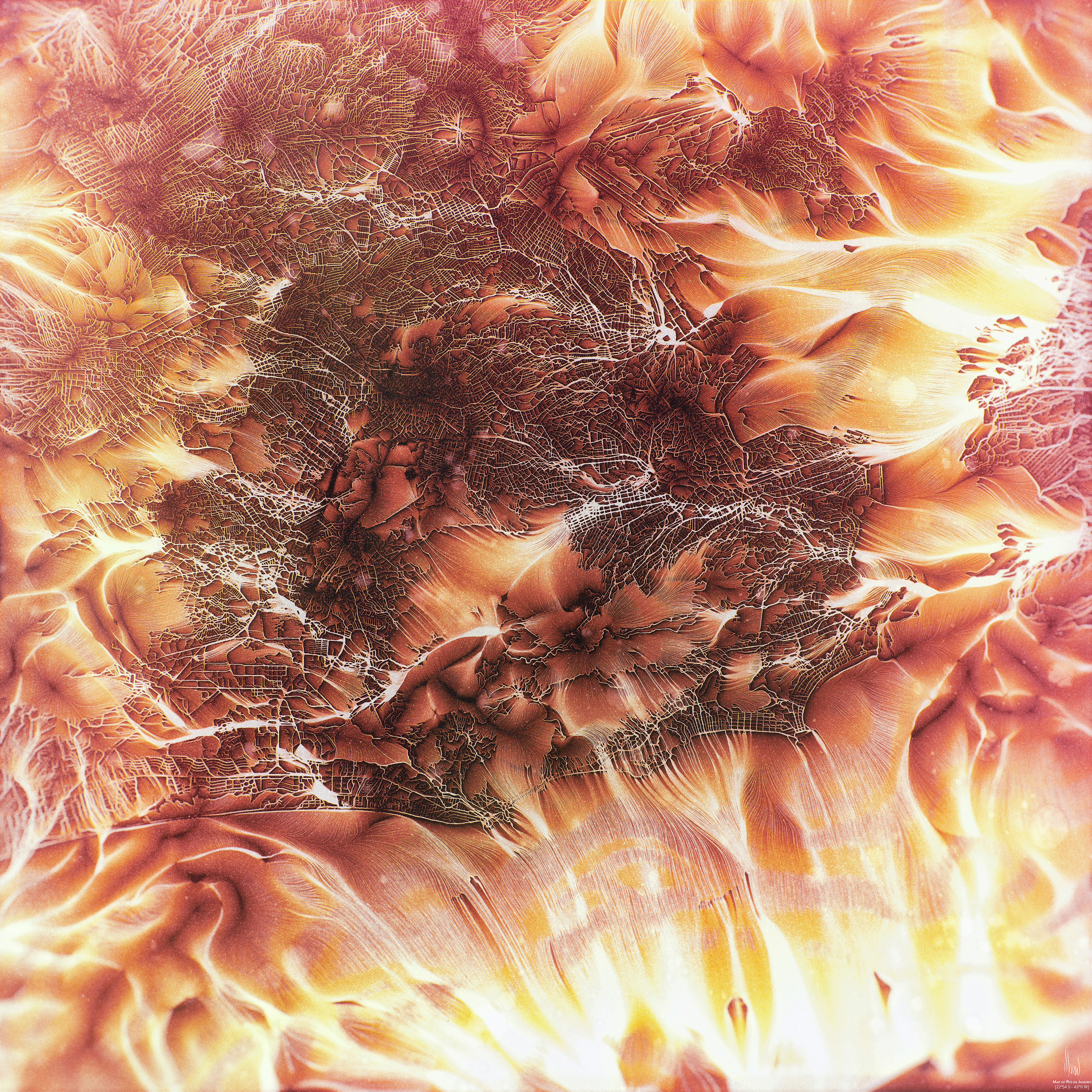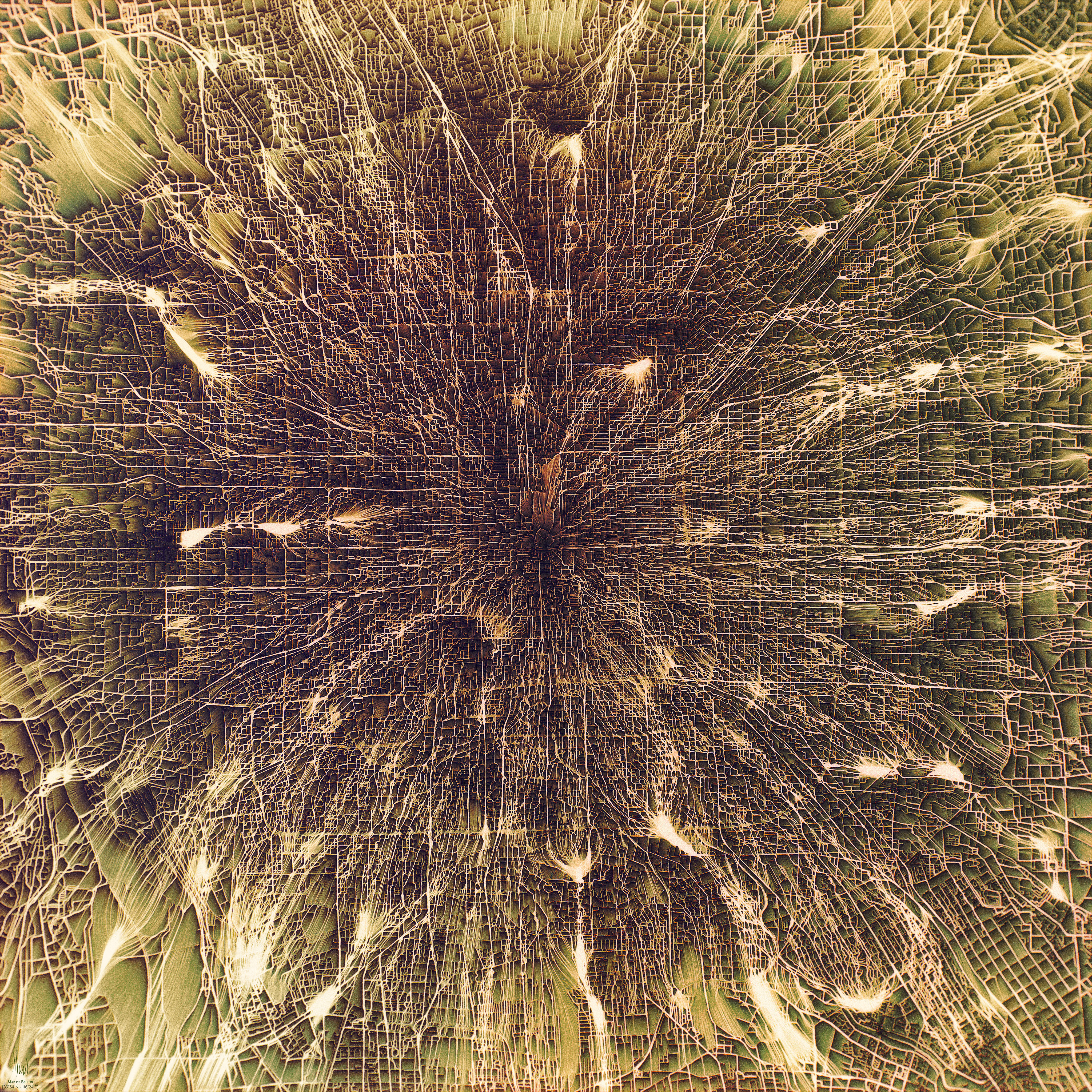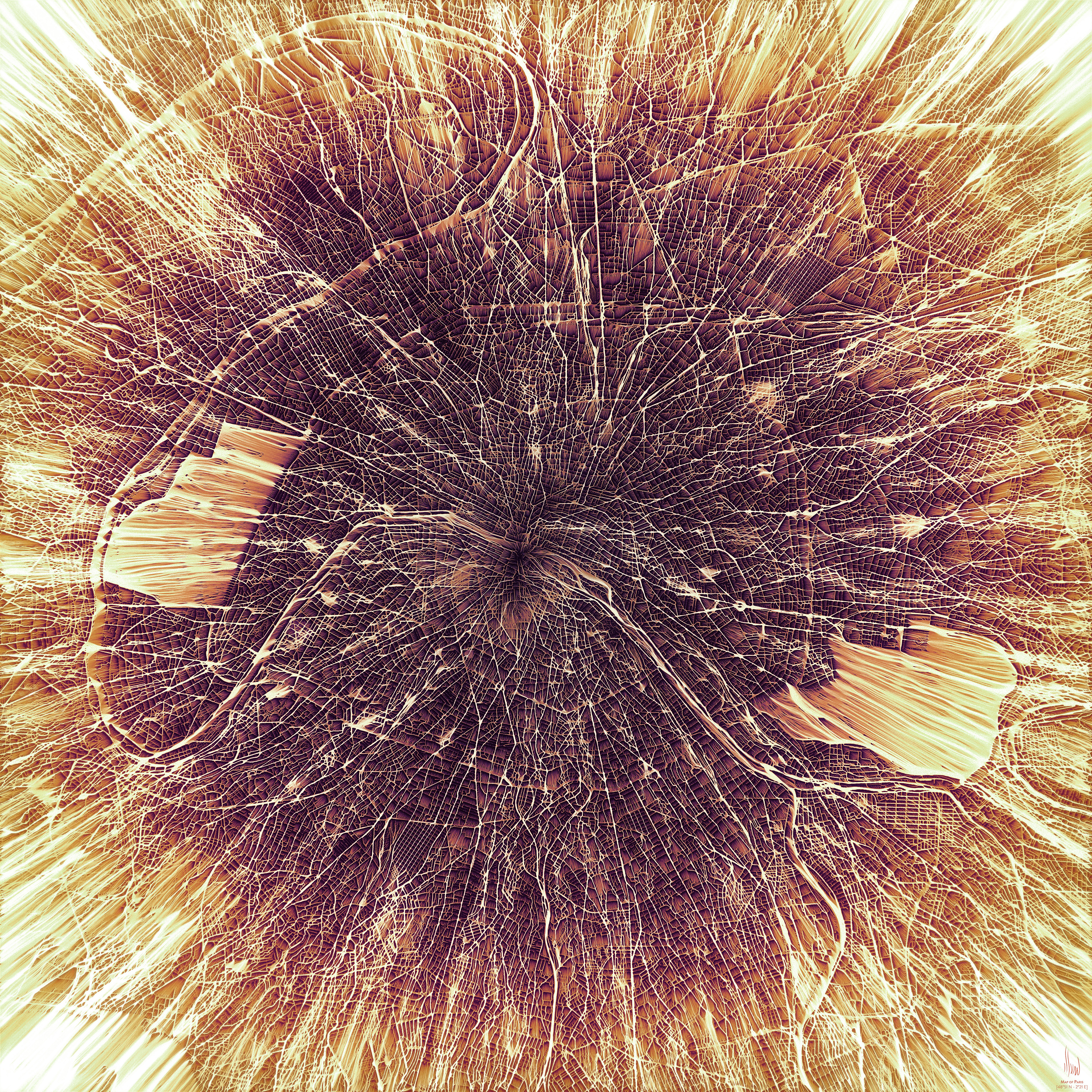 But I didn’t want this flow to follow the actual topology of the city and its surroundings. So I “mixed” the city map with a random noise that simulated an elevation map that the software interpreted like the true elevation map of the city. This way, I was able to change the original flow map to better meet my own vision of the relation each city has with its environment. I used these pictures as a basis for my final illustration and I added colors and effects in order to give to each city a unique identity.