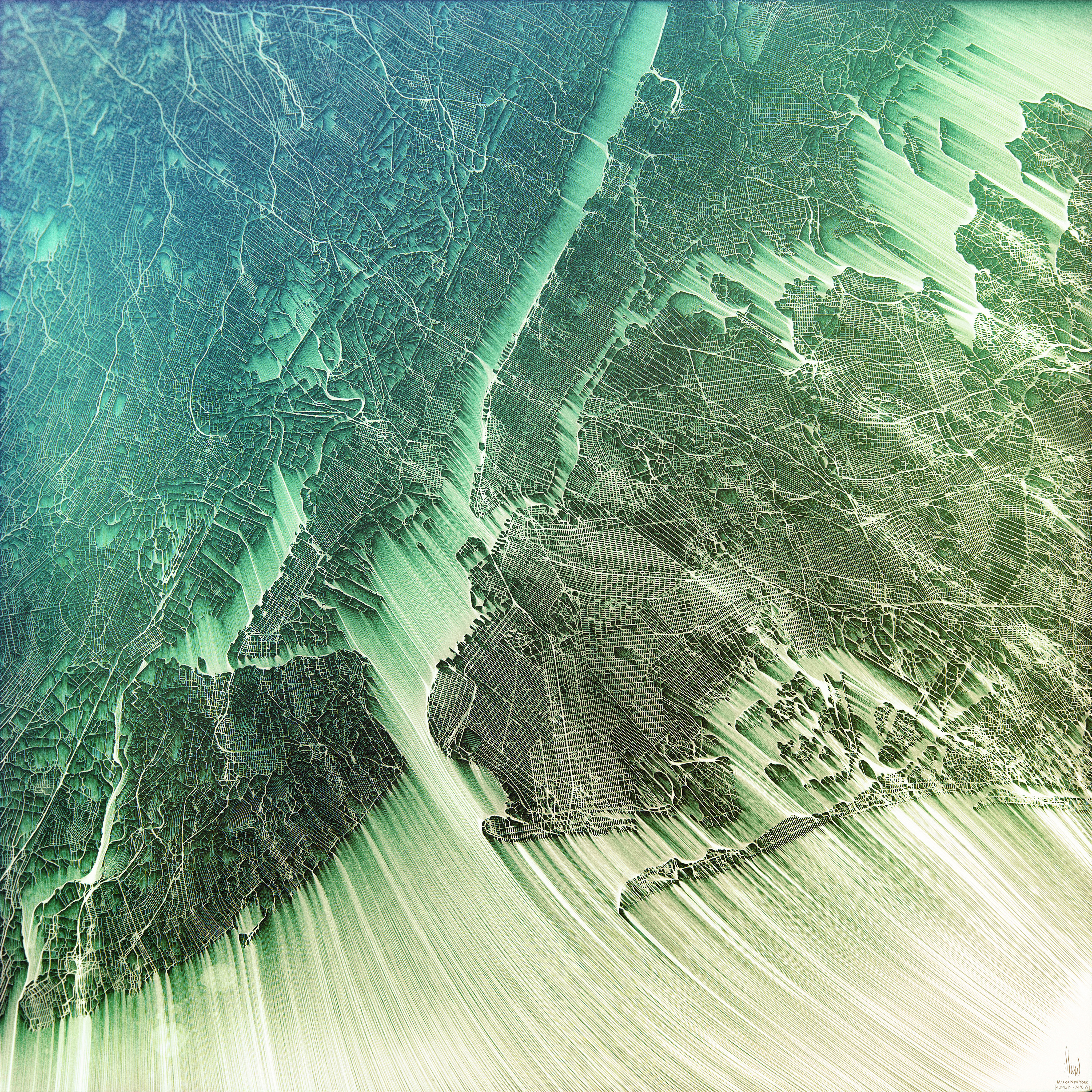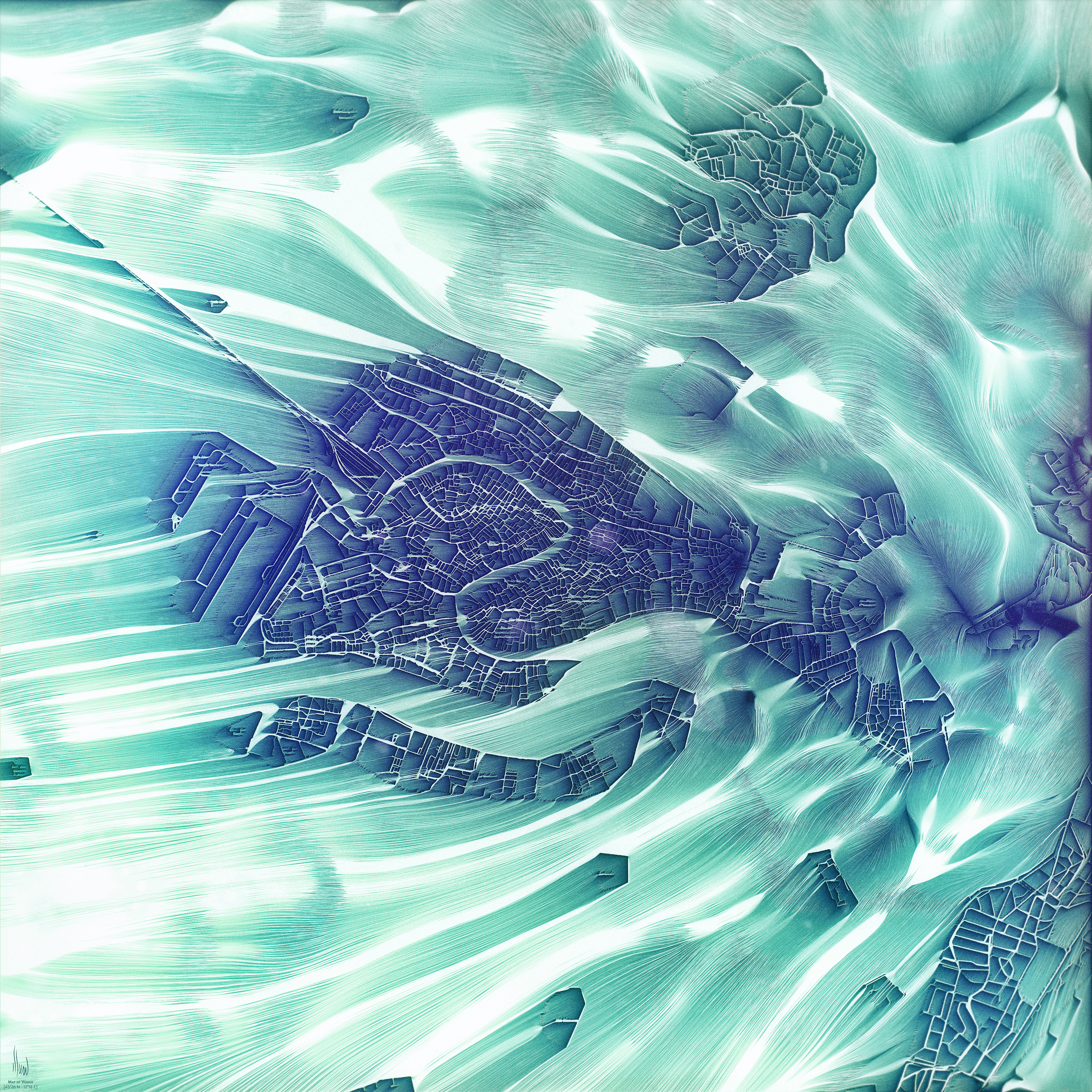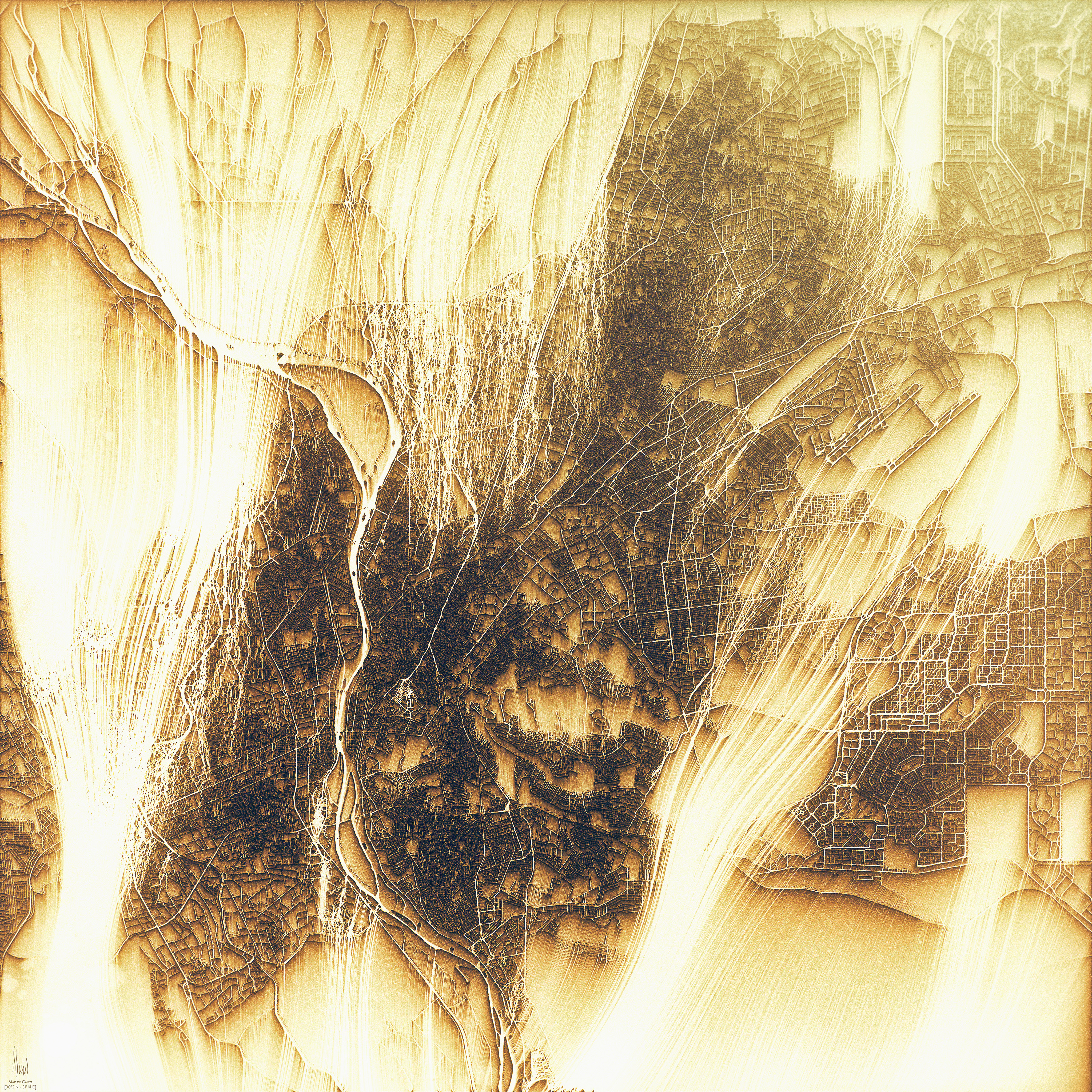 I wanted to represent this relation as a kind of invisible fluid that overflows from the city to its surrounding area. For that, I’ve retrieved city maps and used processing software that specializes in generating eroded 3D terrains for video games. This software can export pictures called “flow maps,” usually made for texturing purposes inside a game editor because they follow precisely the elevation of the terrain.