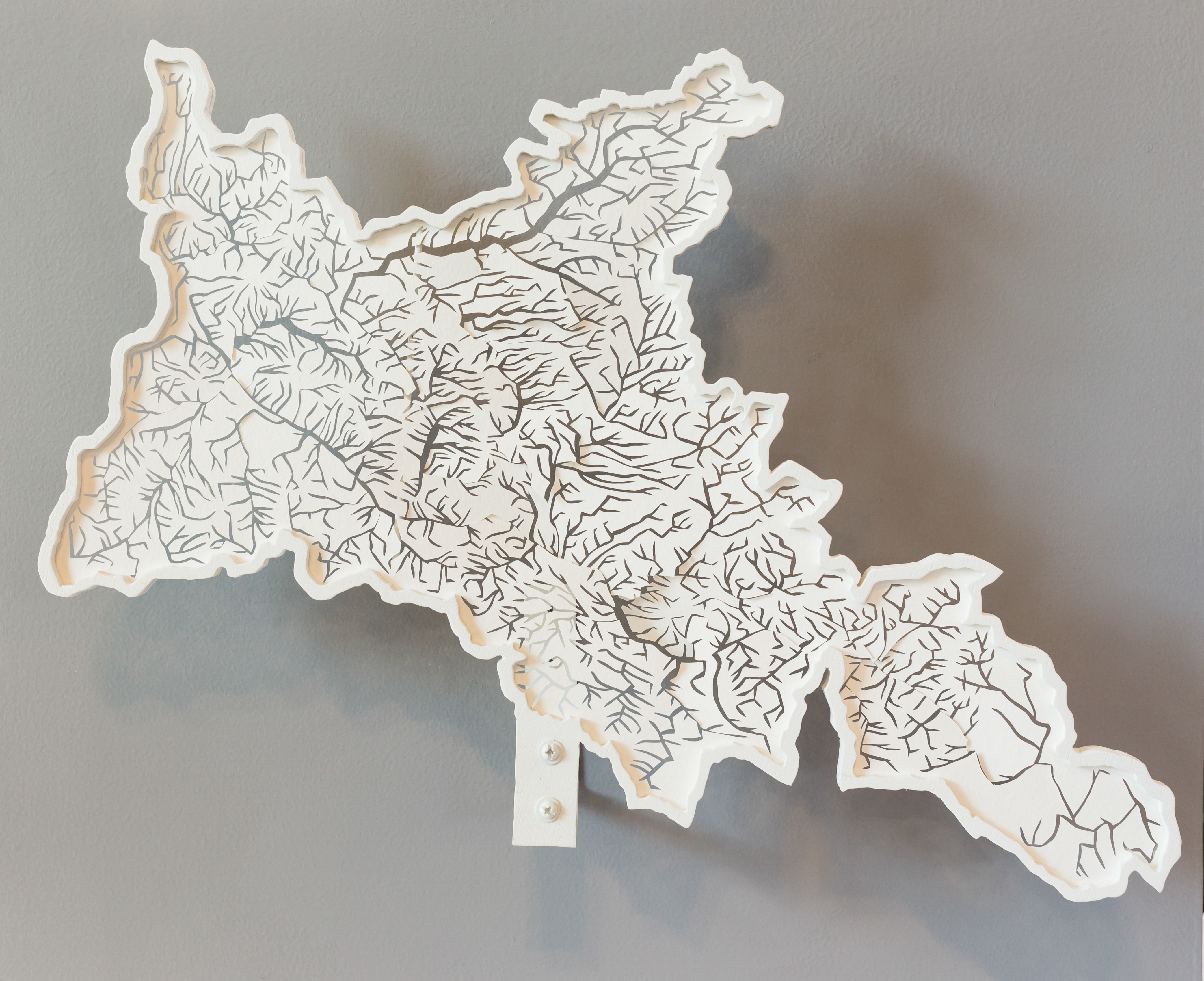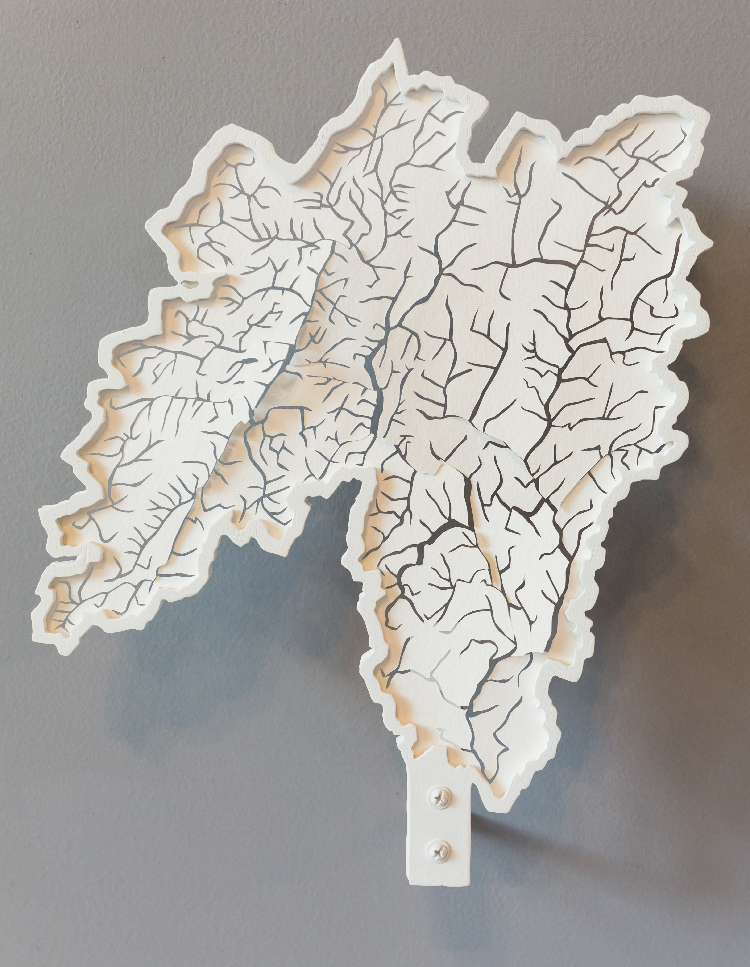 Lauren Rosenthal. 2011. Hand-cut watercolor paper, wood, steel, paint. Top: Mohawk Watershed, 14.5″×21″. Bottom: Upper Hudson Watershed, 13″×15″.