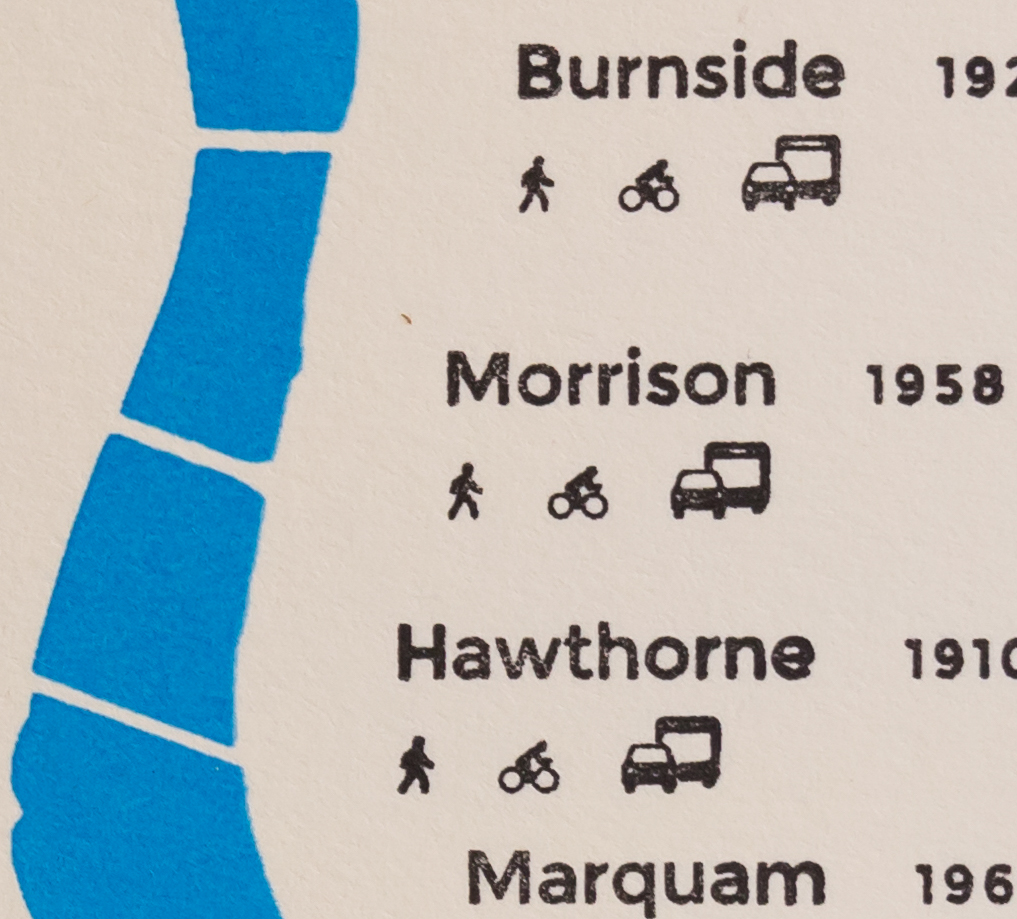 “The Portland Bridge Map is based on the simple idea that most street maps do not convey the personality of bridges…. In the end, we achieved our goal of producing fine quality hand printed maps and rejuvenating a century-old letterpress machine.”