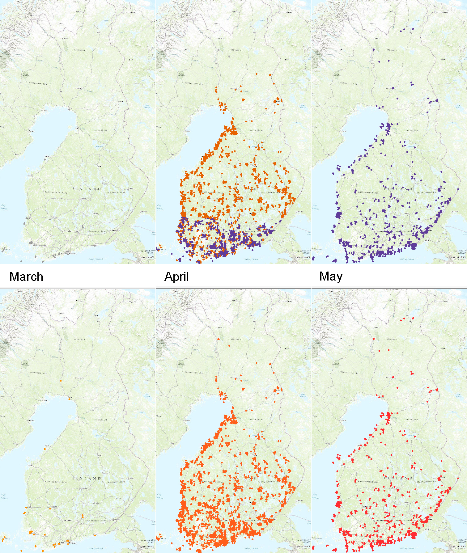 In the traditional animation, the colour of the events changed over time smoothly from yellow (January) via orange, red, and purple to blue (December). Figure 3 compares the classified animation to the traditional animation. The upper row shows three screen captures from the classified animation and the lower row screen captures of the corresponding moments in time from the traditional animation. In March, the phenomenon is steady (very few observations). In April, the growth of the phenomenon has spread to the north (except the northernmost parts), but at the same time it is already decreasing in the southern part of the country. In May, the phenomenon is decreasing throughout the whole country. In the traditional animation, the flow of time can be seen in the change of the colour of the dots. The change in the amount of events, however, can be seen only by the number of dots, and it is not very distinguishable.