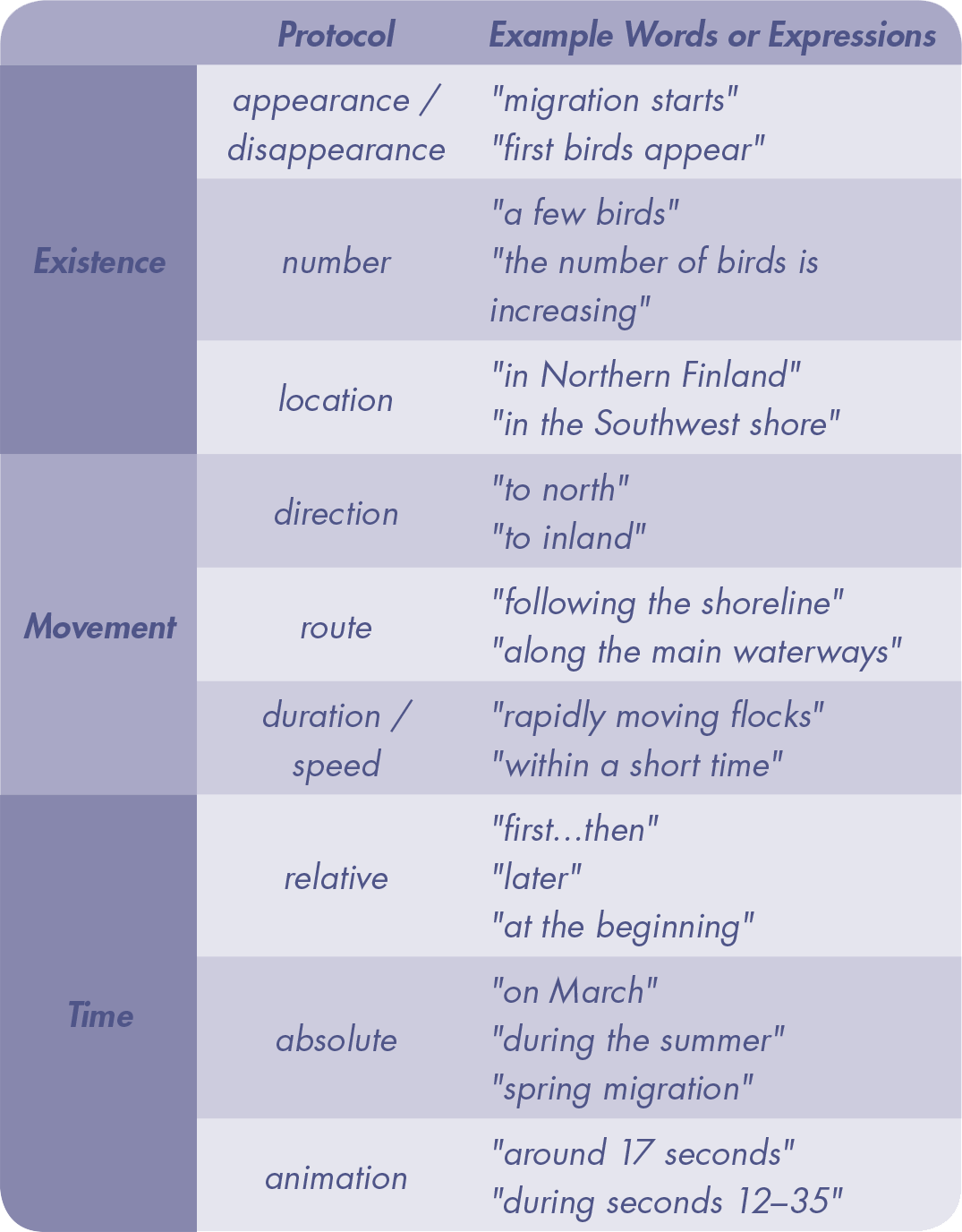 From the data collected in the user test, different protocols were recognized from the texts: 1) appearance or disappearance, 2) number, increase, or decrease, 3) location, 4) direction, 5) route, 6) duration or speed of the movement, 7) relative time, 8) absolute time, and 9) animation time. Then these protocols were organized into three different categories: existence, movement, and time. The protocols and their categories are shown in Table 1, which also shows a few example words or expressions from each protocol, translated from Finnish.