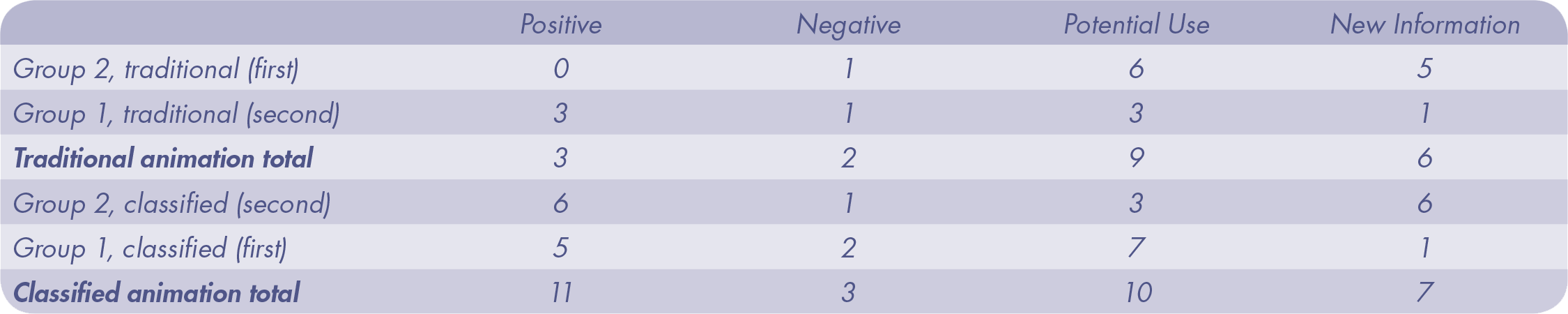 The free text feedback was sorted into the following groups: positive feedback, negative feedback, descriptions of potential use, and mentions of new information gained. These results are shown in Table 3. The classified animation received more positive comments. In both user groups, the animation that was viewed first received more mentions about the potential use cases, but Group 2 made remarkably more mentions of new information than Group 1.