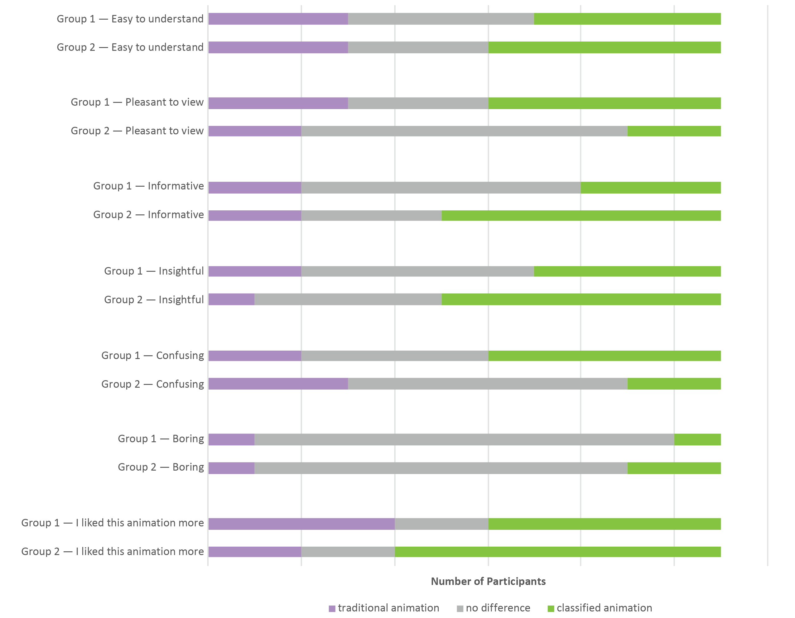 The results show that the classified animation was more often considered informative, insightful, and easy to understand than the traditional animation by both user groups. This preference is even stronger in Group 2, who saw the classified animation after the traditional one. The classified animation was experienced as being more confusing by Group 1, who saw it before the traditional animation. At the same time, however, the majority of the users in Group 1 stated that the classified animation was more pleasant to view.