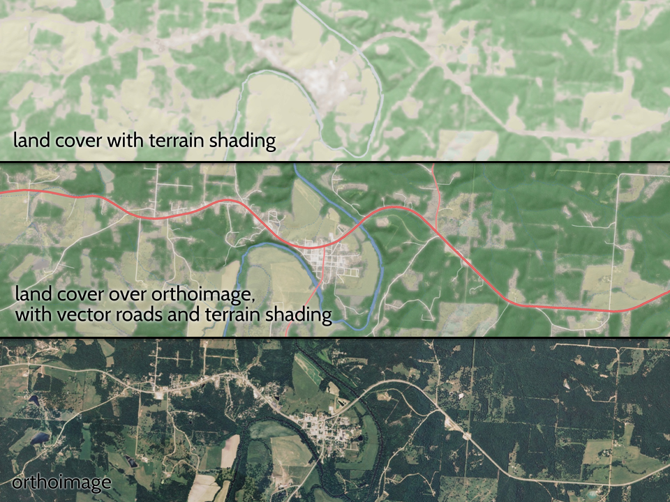 We present an automated suite of data processing and map design techniques for enhancing raster land cover data for cartographic depiction in cases where some boundary accuracy can be sacrificed, such as in general-purpose topographic mapping. Our method is useful for treating data representing classed phenomena, but is particularly well suited to cartographic depictions of land cover, where the boundaries between classes are often naturally fuzzy (e.g., between a grassy field and a forested area). The product layer functions best as a translucent base map, and when combined with other topographic feature layers such as terrain shading and thematic vectors. Figure 1 illustrates the product land cover for the area around Hermitage, Missouri; the land cover is shown in combination with terrain shading, vector symbols, and an orthoimagery base.