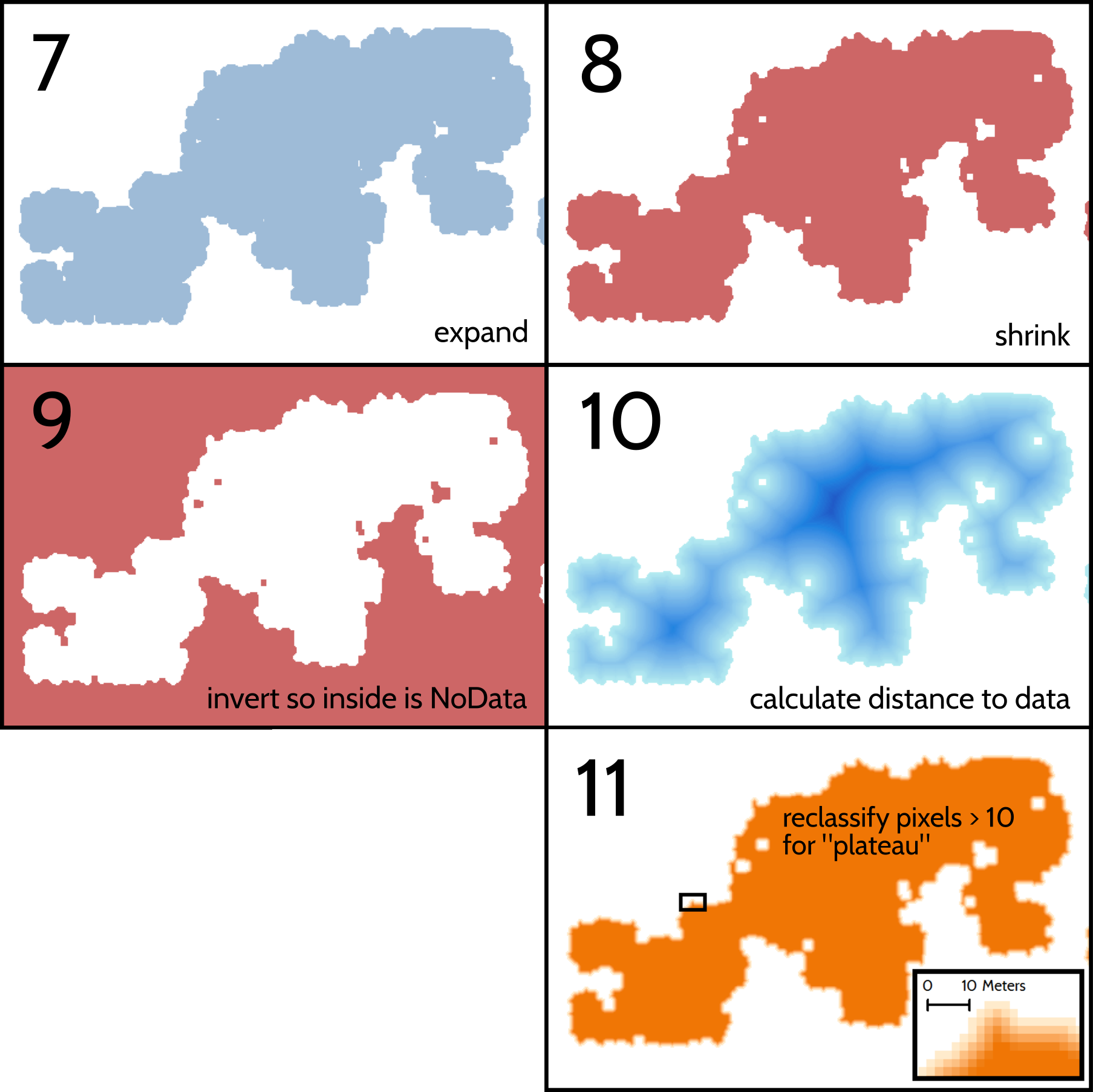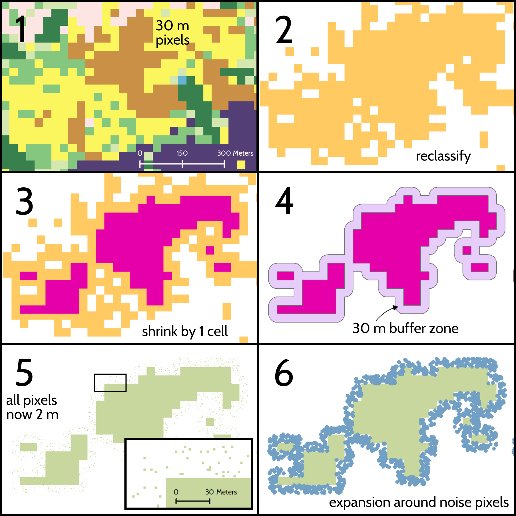 Following reclassification, the raster regions are shrunk by 2 cells and expanded back by 1. This process, common in morphological analysis, has several purposes. First, it eliminates single cells or areas where a class is only 1 or 2 cells wide (i.e., below the width that can be safely regarded as precise), thereby simplifying the shapes and spatial distribution of land cover patches, and removing imprecise, isolated cells. This leaves regions one cell thinner than they are in the input data (see Figure 4, number 3). Removing isolated or thin regions of cells in this manner reduces the analytical precision of the data, but this is by design, since the product being developed is a generalized land cover base map and not a precise analytical dataset.