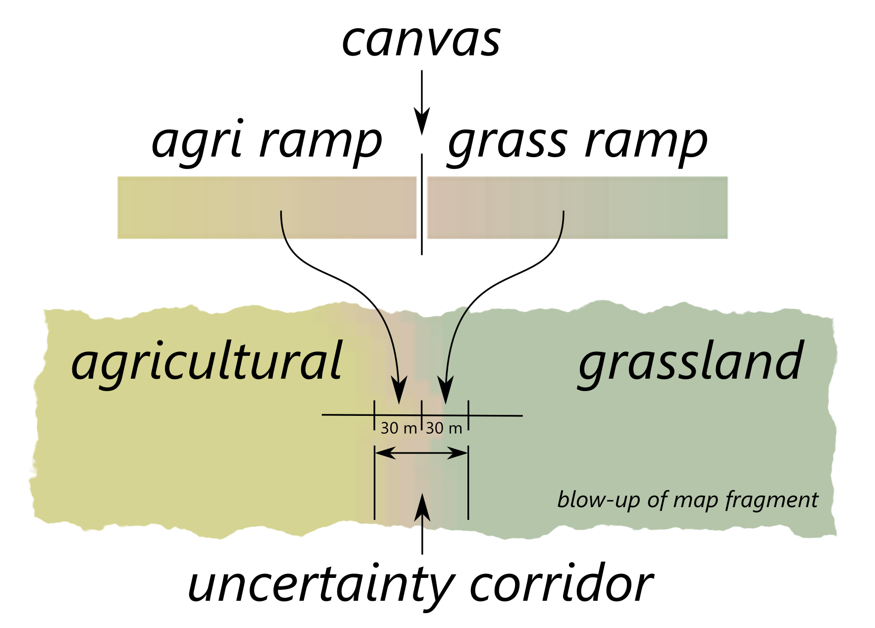 The two interacting factors of natural edge ambiguity and cell imprecision lead us to consider boundaries between raster land cover classes as lying along an uncertainty corridor, constituted of mixed pixels. Figure 3 illustrates the uncertainty corridor between two distinct land cover regions. According to the sampling theorem, we cannot be certain of precisely detecting or representing an object that is smaller than twice the pixel size. It follows that the precision of the location at which one land cover class ceases and another begins is no finer than the width of two cells in our input data. We therefore regard the cell immediately on either side of a region border as inherently uncertain, and use the concept of a 2-cell uncertainty corridor to describe all such uncertain areas in the input raster.
