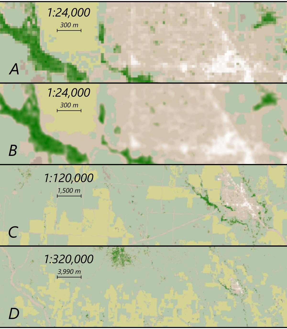 Figure 12 illustrates the product of this processing at various scales in the area around Memphis, Texas. The original-resolution NLCD data are reclassified and colored according to our specifications in A, the product of our large-scale processing is shown in B, and land cover for two sample smaller scales are shown in C and D, respectively.