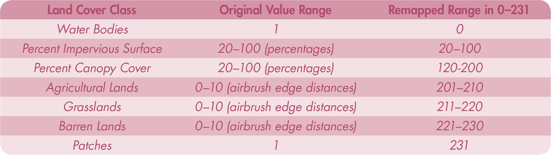 Table 2. The classes used in the land cover implementation, their input values at the end of geoprocessing, and their remapped cell values in a single 8-bit integer raster for symbolization using a color map.