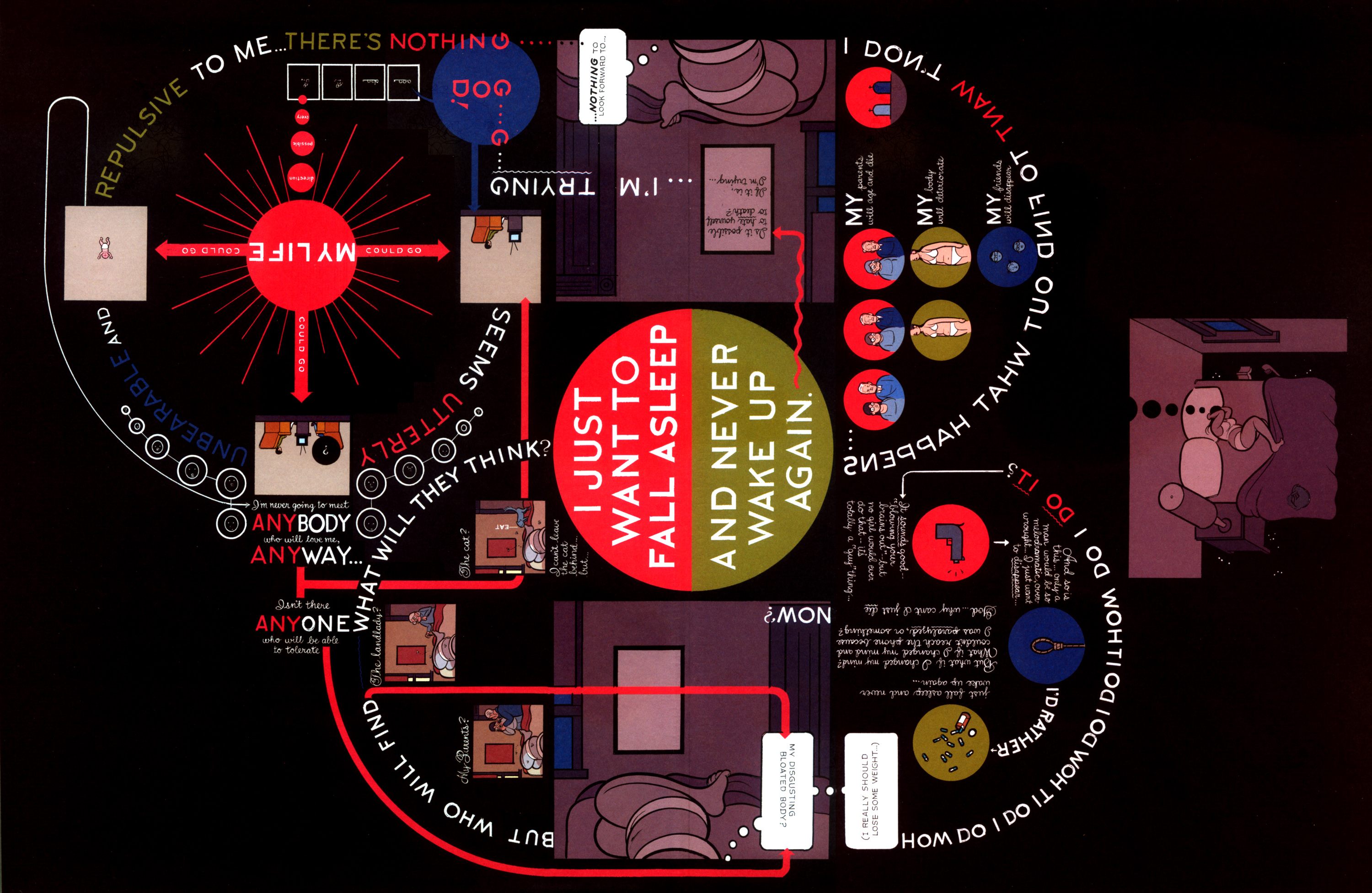 The spread is, quite clearly, a map of the topography of this woman’s nighttime thoughts. She, and every reader, is able to, and in fact must, undertake a journey across and through this mental landscape. Like any topographic map, this map makes some landscape features explicit, and maintains silences on other features that may well exist; hiding them from both the sleepless woman and the map user.