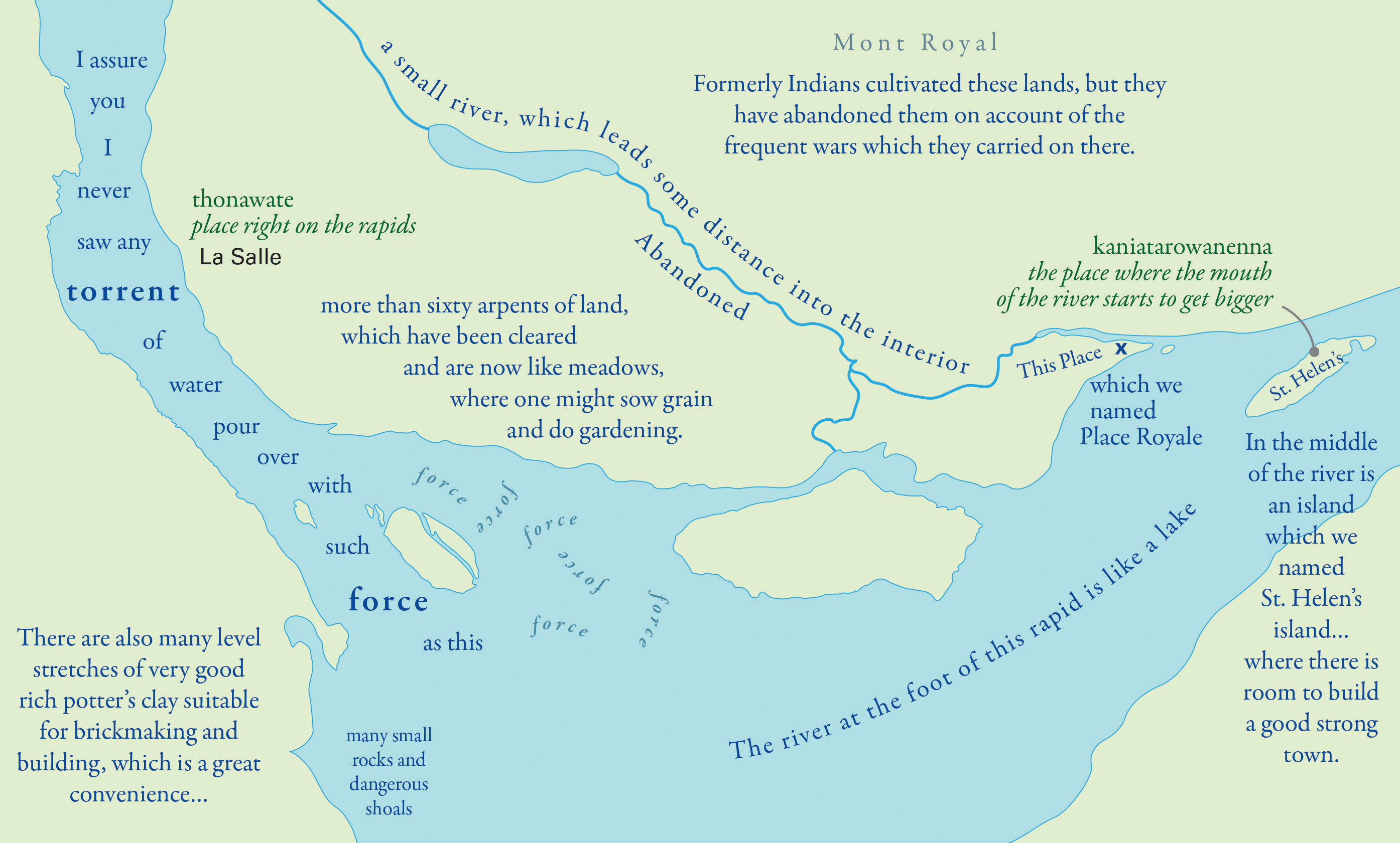 …Champlain’s words are the star. The text is supported and enhanced by the spatial representation, not the other way around.