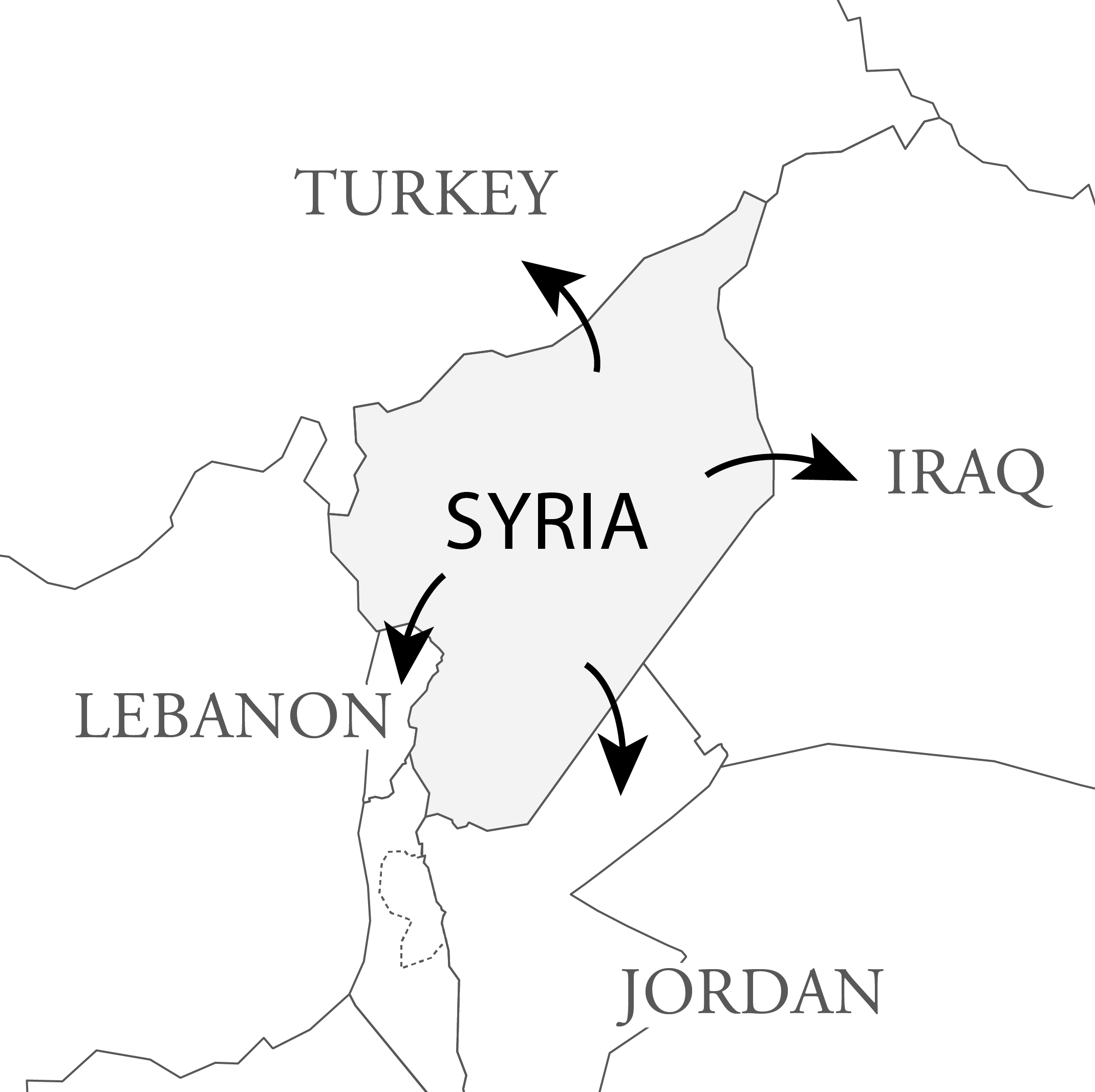 Figure 1. A familiar depiction of Syria and its neighboring countries that uses conventional border symbols (solid and dashed black lines) and smooth, unhindered flow lines showing refugee movement.