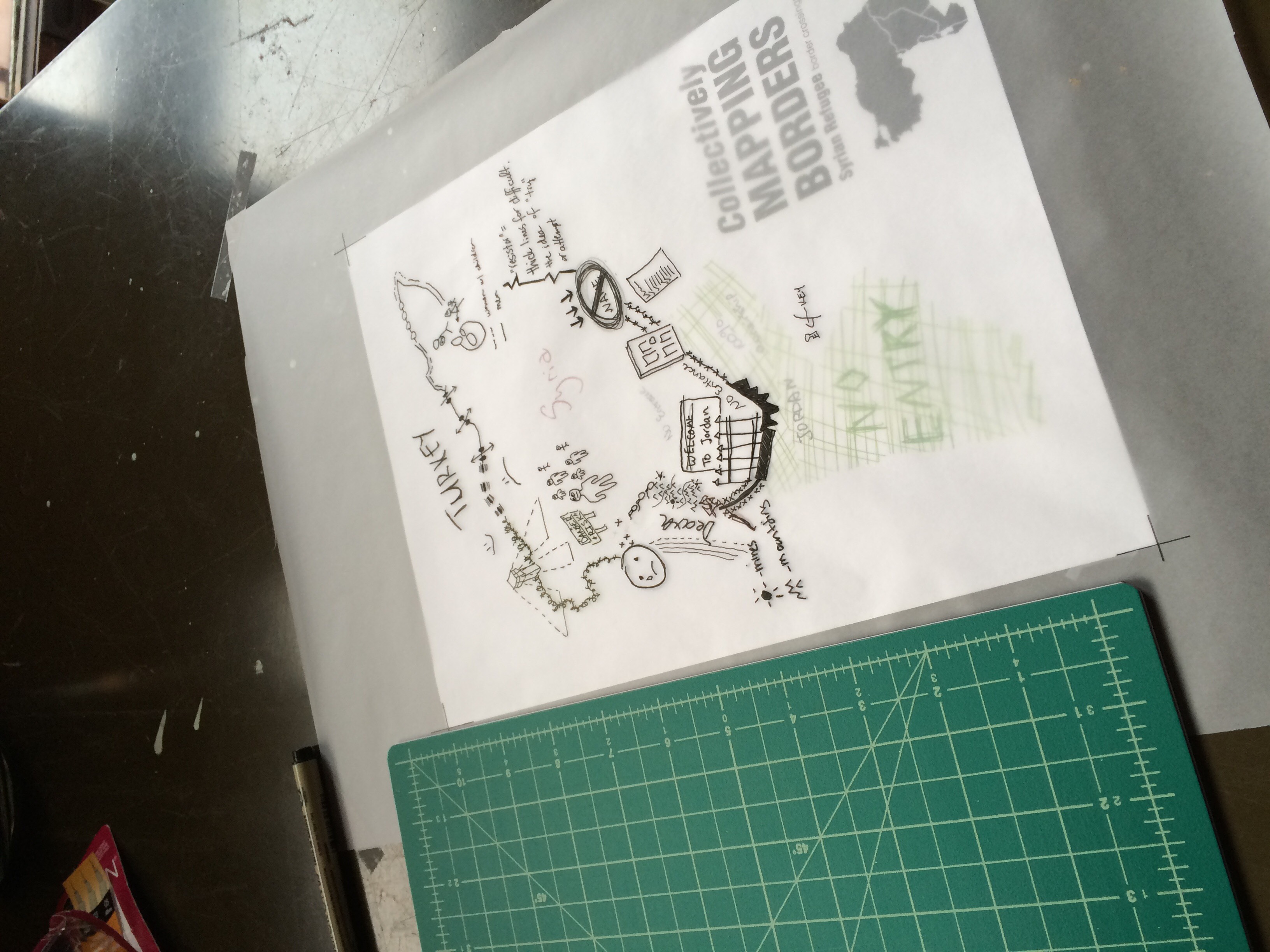 Figure 5. A photo mid-process that shows my ink tracing on top of the composite representation of Syria.