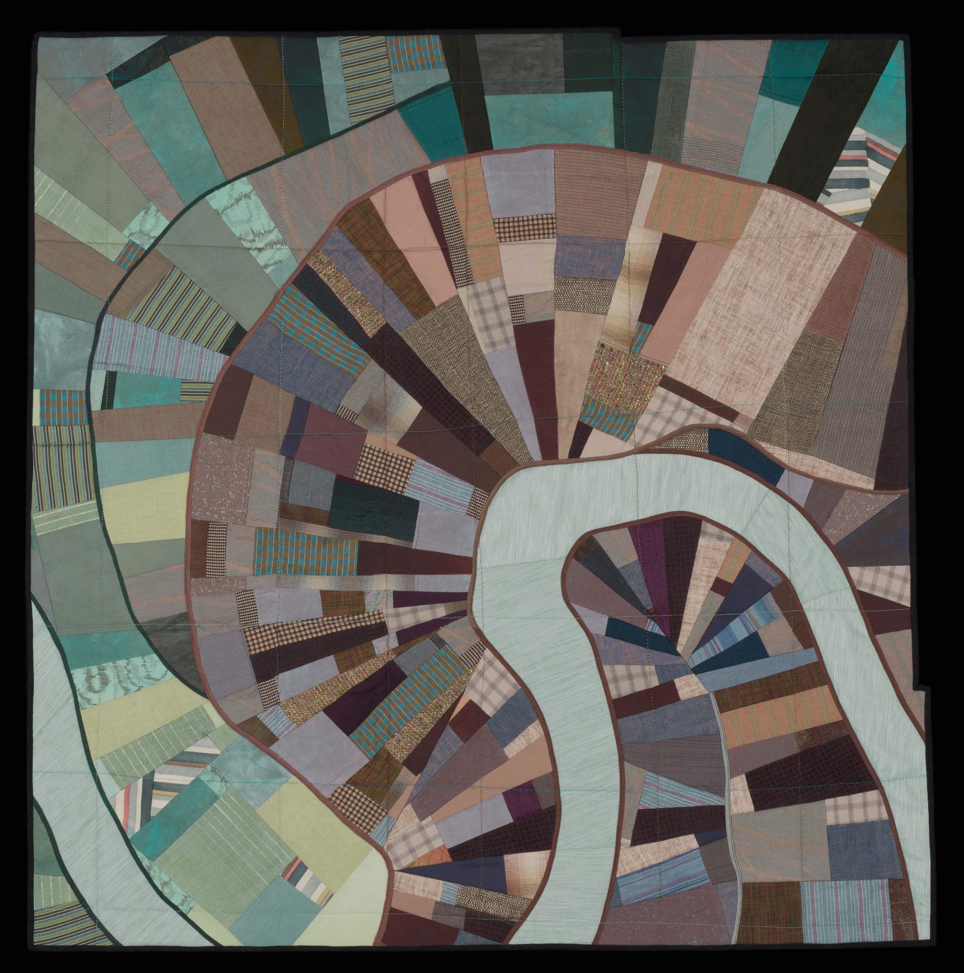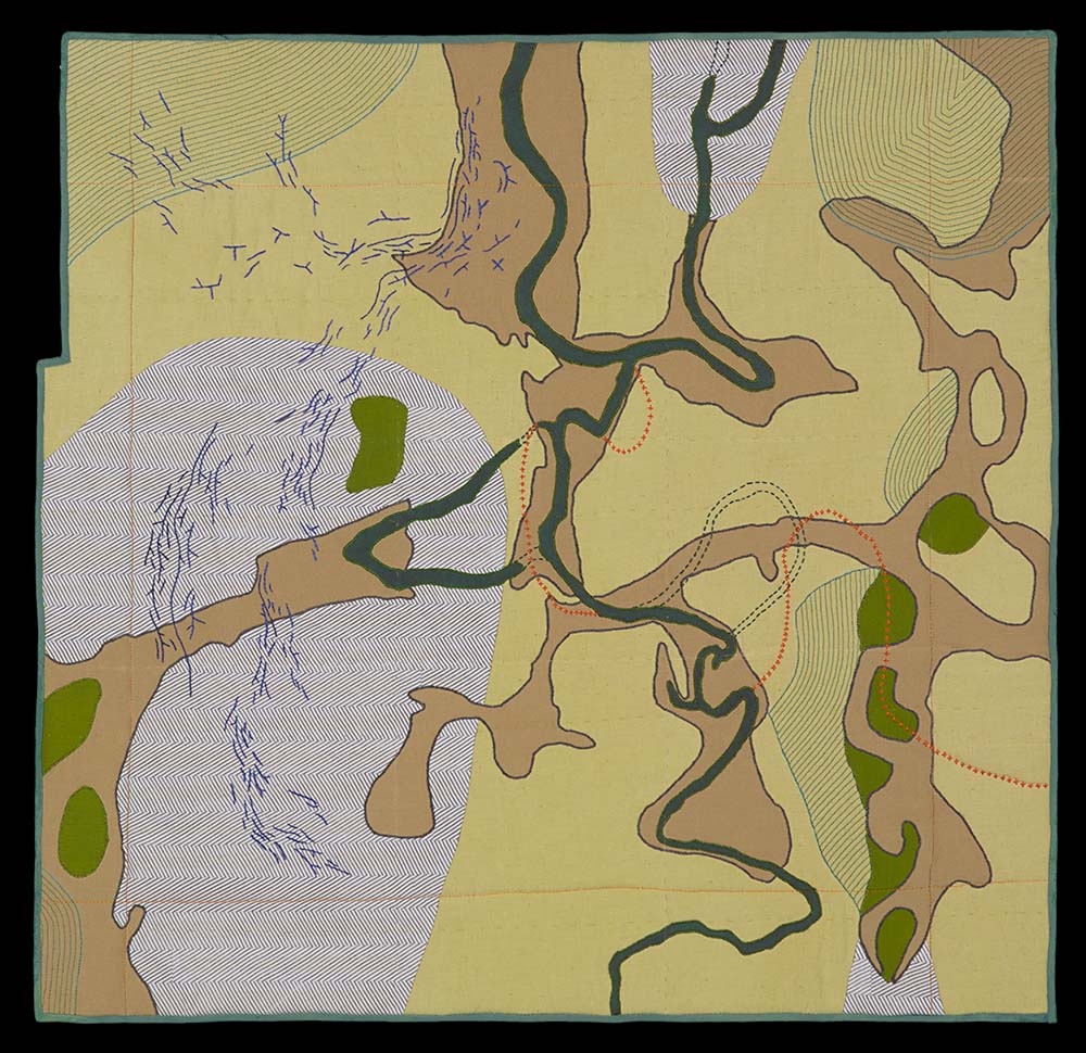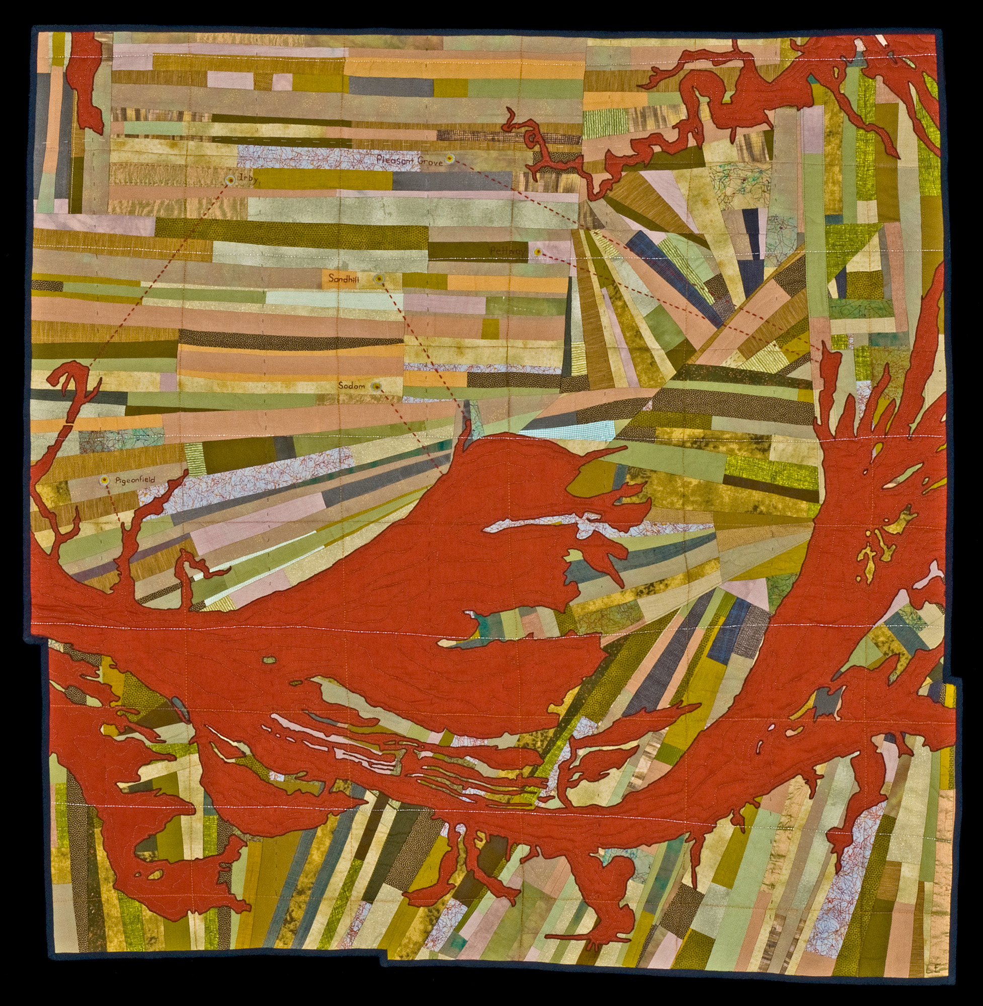 This is a fairly accurate map of Gee’s Bend, Alabama and is inspired by J. R. Moehringer’s Pulitzer Prize-winning article titled Crossing Over. The article explores the journey of life and death as it relates to the history of the bend in the Alabama River, near Boykin, Alabama. This is a place where freed slaves were marginalized, yet found ways to thrive. The piece is also inspired by the quilt traditions of the women who lived and worked on the land. The pieced sections reference the strip quilting of the women and property divisions common to the South. In the article, the Alabama River becomes a metaphor for the River Jordan. The place names are those of existing cemeteries and the dotted lines represent the passage between the graves and the river.