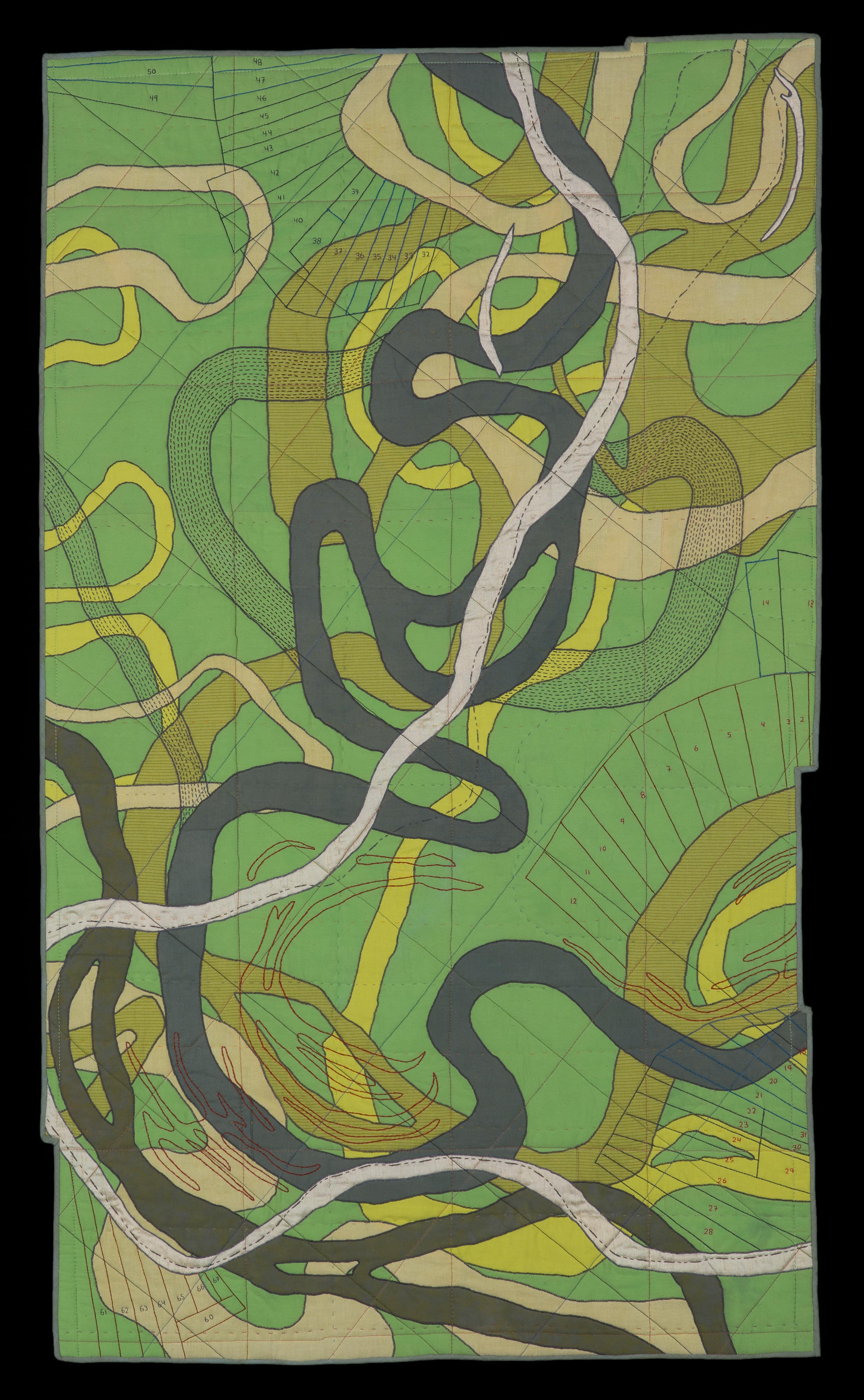 This piece is based on Harold Fisk’s map created for the Mississippi River Commission in 1944. While it is not an accurate portrayal of Fisk’s map, it is inspired by how his map shows “traces of [the rivers’] previous courses, twisting and writhing in a vast intestinal tangle.” The white silk represents the idea of “tamed” boundaries of a river after being set by the Corps of Engineers. I think of it as the skeleton left behind after the more lively parts of the river, the muscle and sinew, were suppressed. The numbered long lots show a history of people re-establishing ownership in response to the changing river.