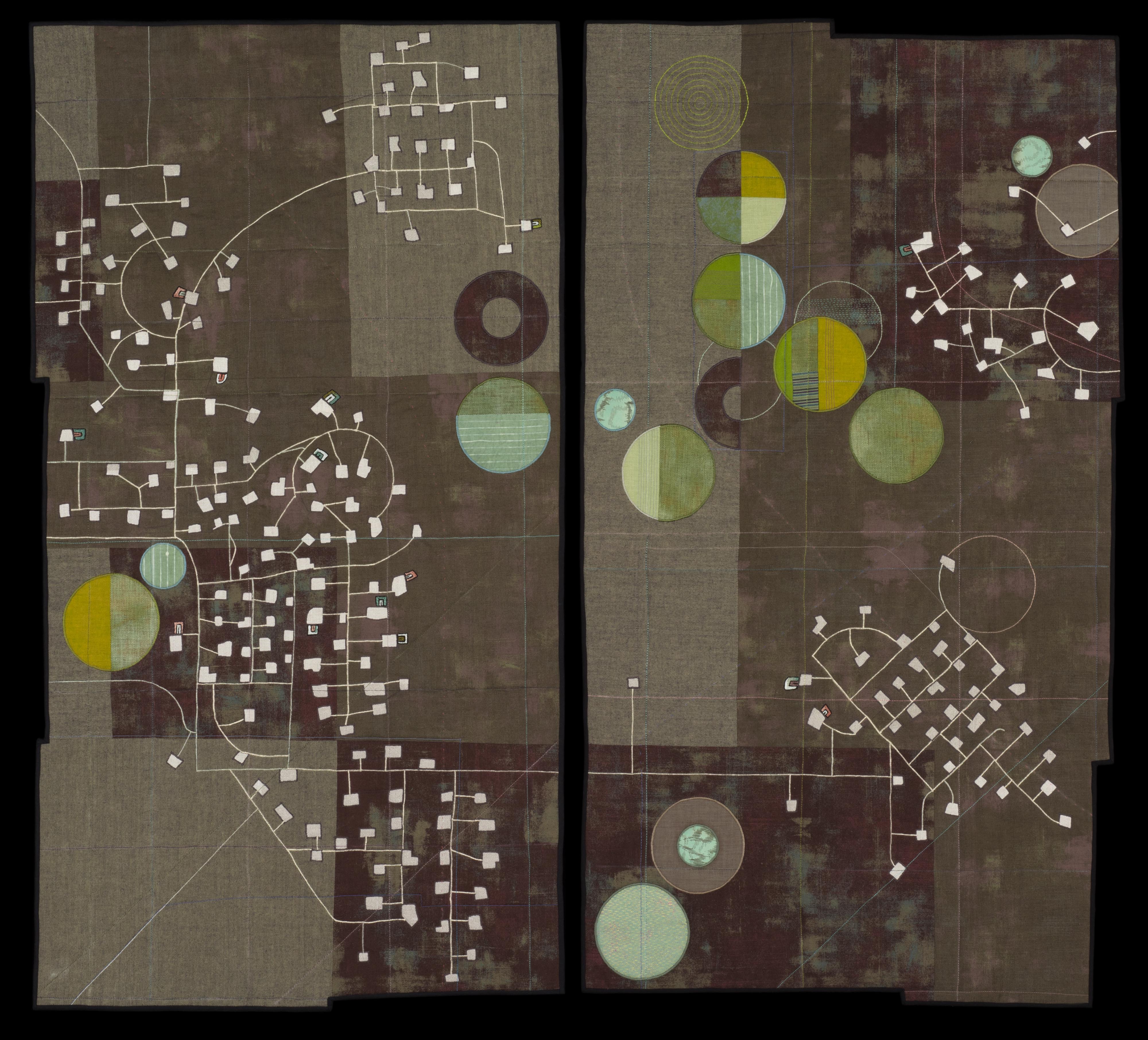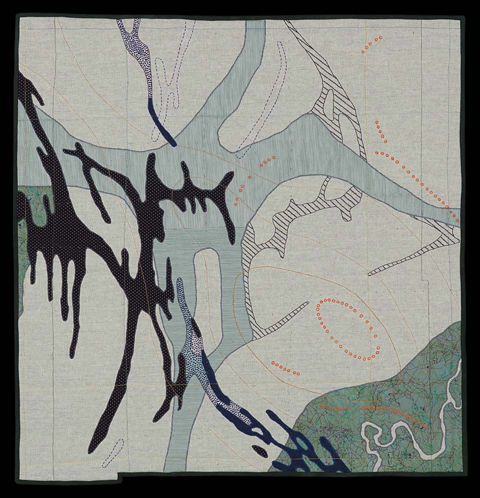 It is the use of maps in organizing our ideas of land that interests me most of all. My focus is usually on human-impacted landscapes and visual evidence of our interaction with land. Many of my pieces are not based on specific places, but occasionally I will work from historic maps or use imagery from existing maps, creating an entirely new experience. For me, the pieces are intimate explorations of map language and imagined landscapes. The story is enhanced by my use of salvaged materials like secondhand clothing, upholstery scraps, and vintage kimonos. My process involves layering cloth by machine stitching, cutting, and hand sewing. The subtractive technique of reverse appliqué creates water boundaries and mimics erosion. Layering cloth and stitching lends itself to representing development.