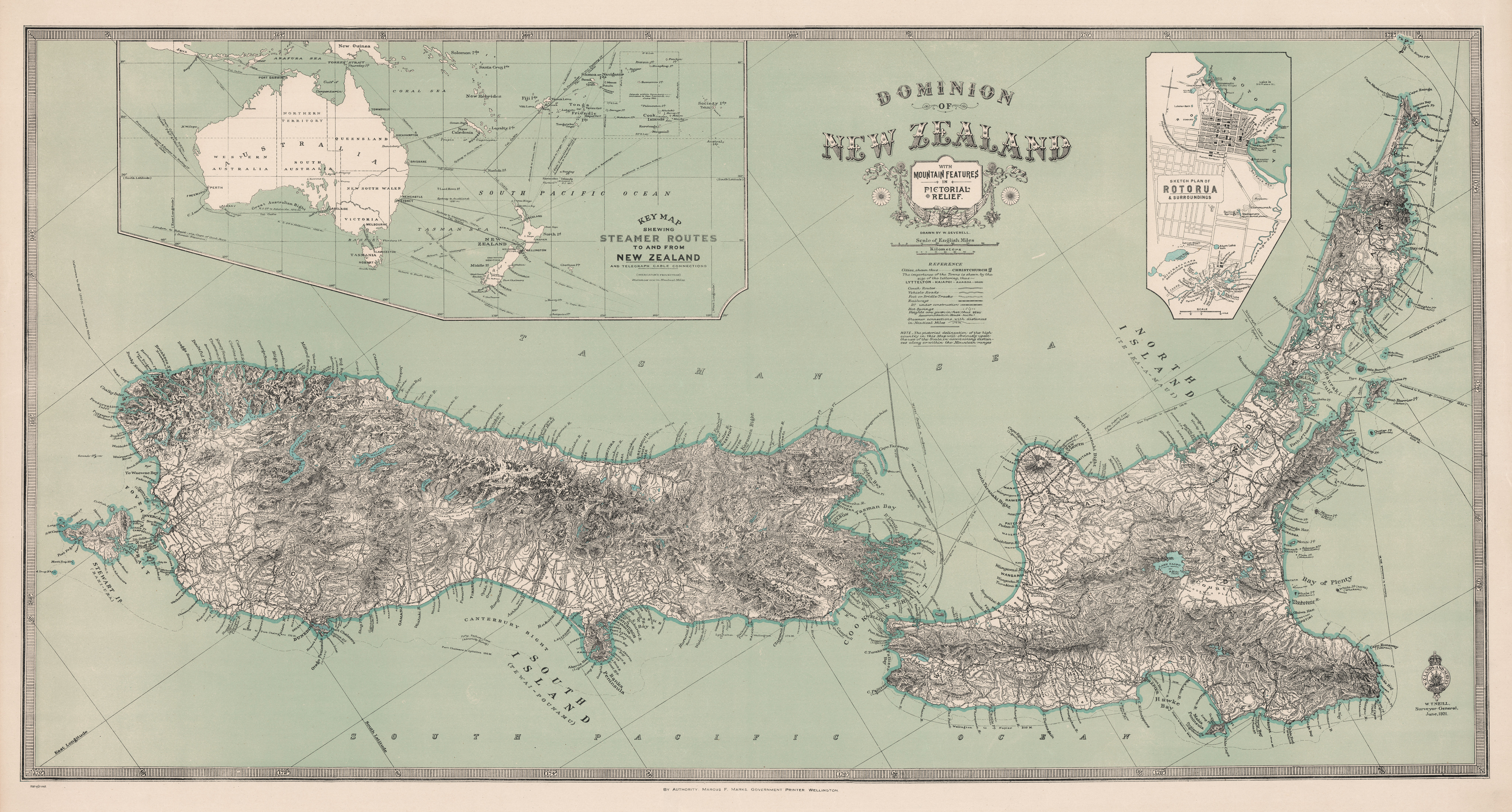 Figure 1. Authoritative Maps: New Zealand Mapping Service series 24 (NZMS 24) map “Dominion of New Zealand with Mountain Features in Pictorial Relief”; published in 1921 at the scale of “one inch to 25 miles” (1:1,584,000) by New Zealand Lands and Survey Department. This innovative, aesthetically attractive, and authoritative map encapsulates the ever-present spirit of New Zealand cartography and its drive for excellence.