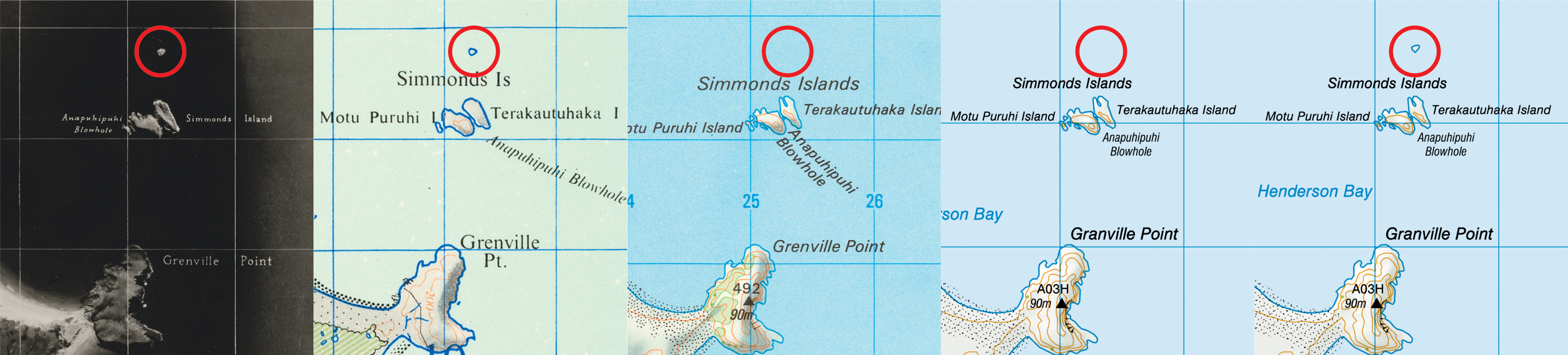 Figure 2. (Re)Discovery: While working on NZMS 3 NZ Mosaic Map sheet N4/9 & N6/5 from 1953 (1), Benjamin Jones, Digitisation Technician, noticed a small island north of Simmonds Islands (see red circle), which he could not see on the then-current 2013 NZTopo50 map (4). Further research revealed the island was last shown on the imperial NZMS 1 NZ Topographic Map in 1977 (2) before disappearing from the metric NZMS 260 Topographic Map published in 1984 (3) and all subsequent maps for over three decades! His finding was forwarded to LINZ who, after its own investigation, confirmed the island’s existence and reinstated it on the most recent edition of NZTopo50 map (5) in 2016.