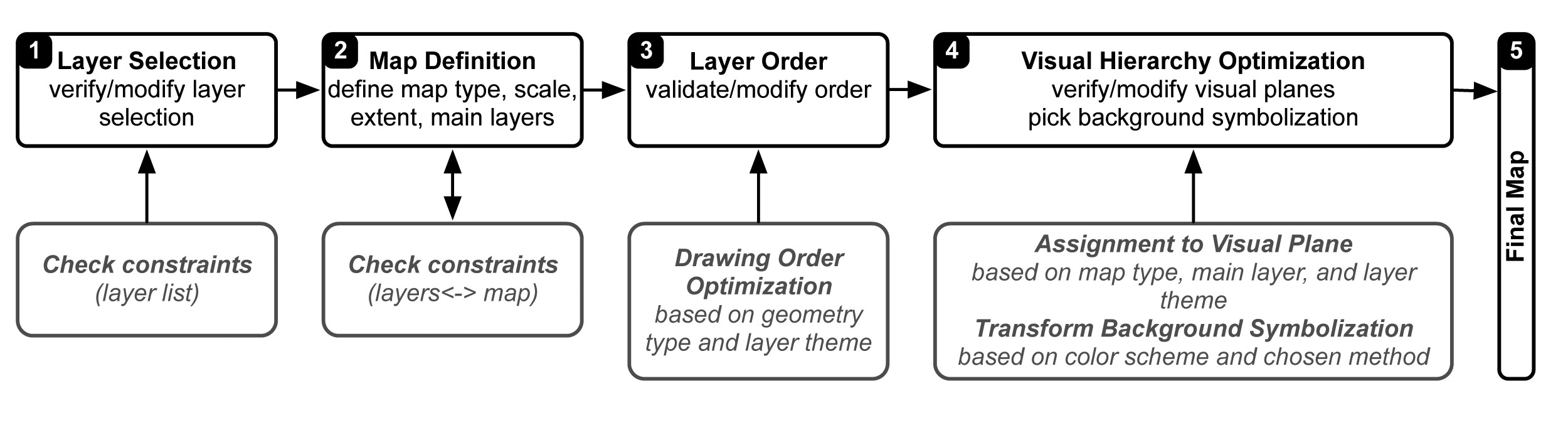As mentioned earlier, a wizard was used to organize the geoportal’s cartographic functions meaningfully. A wizard should be able to capture the user’s requirements in an efficient manner with a minimal number of clicks, while offering a pleasant user experience. We integrated cartographic functions within the GUI over two major design iteration cycles. The first design iteration included organizing the cartographic functions and interactions into steps to offer a smooth wizard workflow. Our different steps were: (1) layer selection, (2) map definition, (3) layer order, (4) visual hierarchy, and (5) final map. Figure 3 shows the steps and how they related to the cartographic functions. The selection of layers occurs at the beginning because the users were familiar with selecting layers as a first step before downloading them (as this was a pre-existing geoportal function). Steps 2, 3, and 4 check user parameters against map content and offer to optimize different aspects of the map. To add support for thematic mapping (i.e., classification method and color scheme selection) would require an additional step between 3 and 4. In traditional cartographic workflows, there would be a step to pick symbols; however, as the symbology modifications in step 4 rely on the existing layer styles where the symbols are defined, there is no need for symbol selection in this specific application.