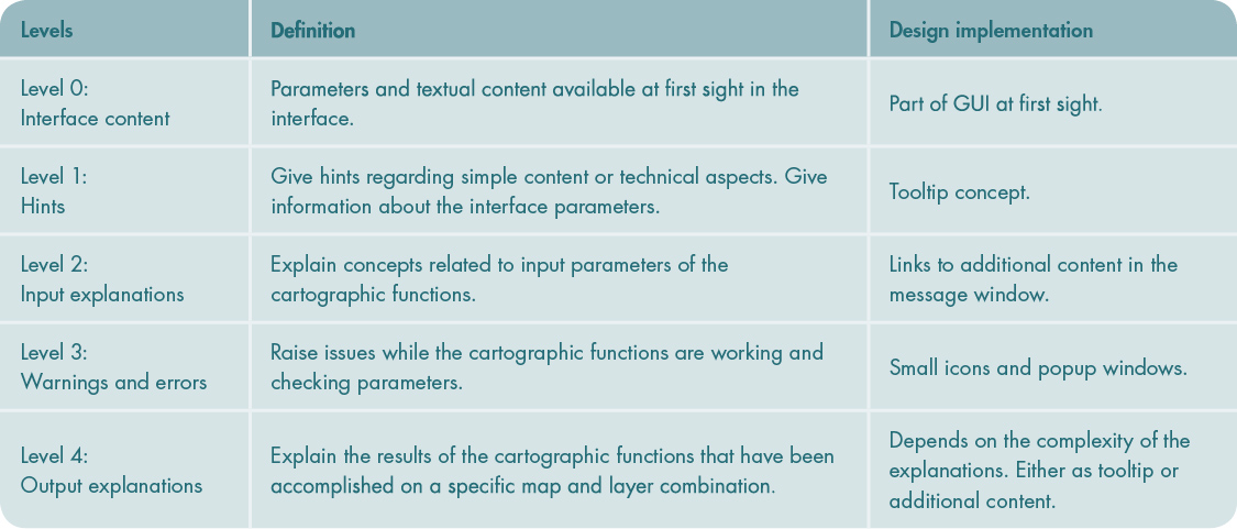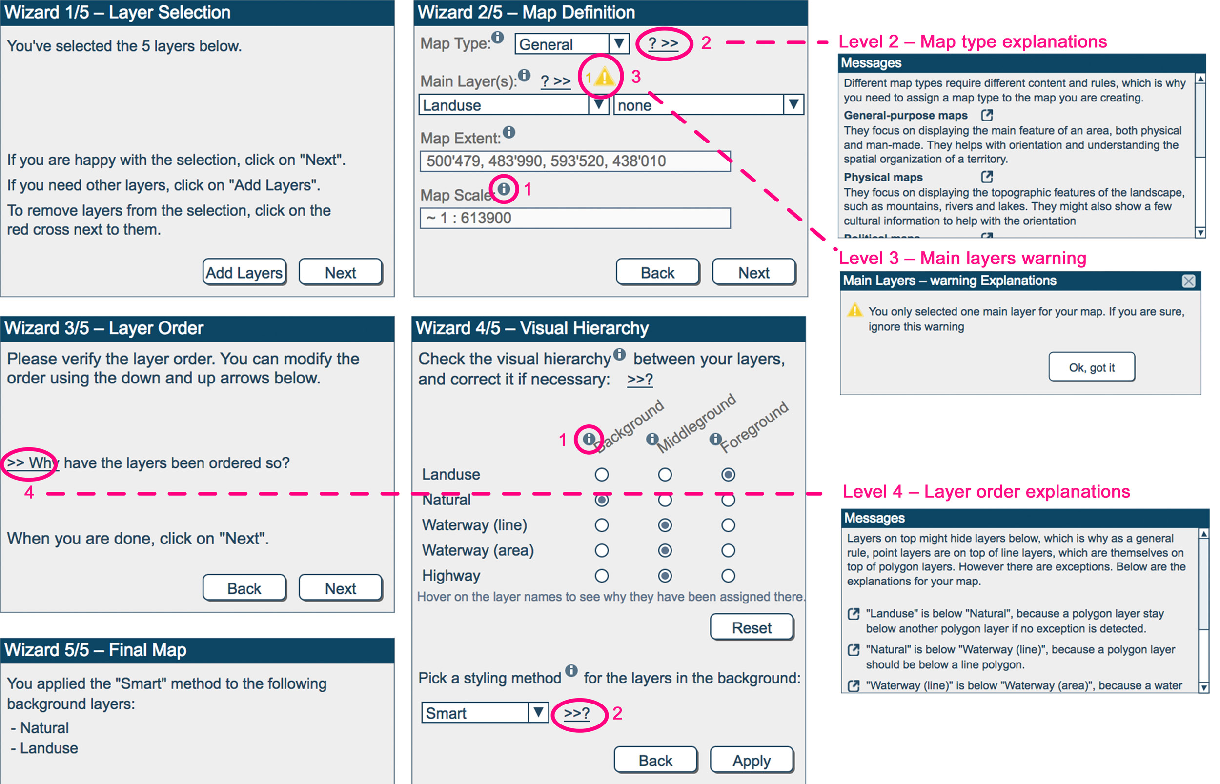 We organized information flows going from the wizard to the user in several levels based on the type, complexity, and depth of information provided. This cascading type of organization of the interactions helps with providing crucial information at first sight in the interface with little noise, while providing access to more detailed information on demand. Complex information about the inner workings of the cartographic functions is available for advanced or curious users, but does not clutter the interface unnecessarily for the other users. Table 1 breaks down the levels, while Figure 5 provides examples of the information cascade.