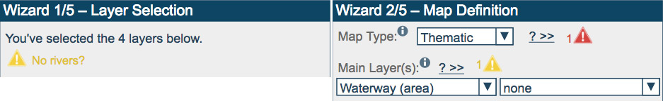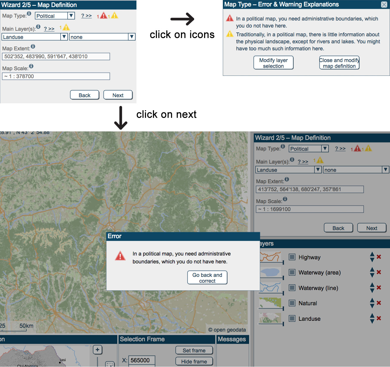 The tests also revealed some successes of our interaction concept. One of these was the frequent use of warning and error messages. These messages provided information about cartographic rules behind the constraints and modifications applied to user maps. The participants applied an exploratory strategy, trying different options as a means to understand the explanations in relation to changes in the map parameters and in the map itself. As the changes were applied immediately to the map, the participants did not have to wait until the end of the wizard process to see how the parameters impacted their map. The messages, which are specific to the user-generated maps in question, are thus complementary to the general explanations: they deliver the same information but put it into perspective. It helps the participants to understand how the general rules apply to their unique, specific context. The distinction between warning and error messages was well understood, likely because it was built on known signifiers and familiar conventions by using red for error and yellow for warning.