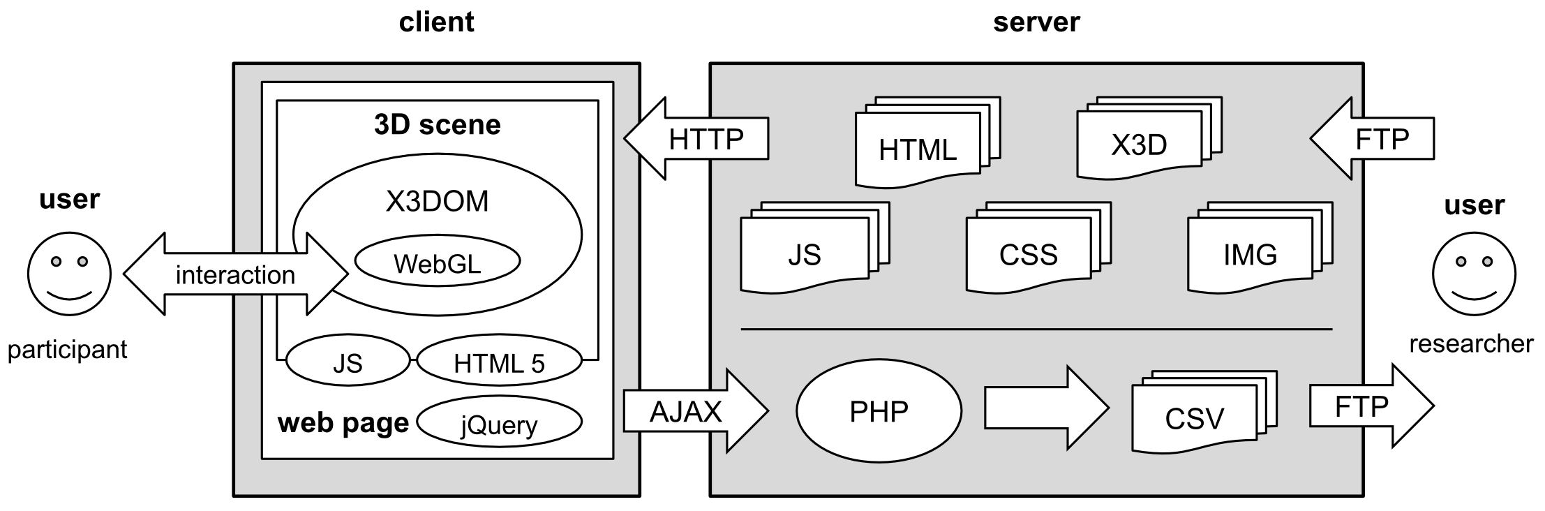 Open web technologies were chosen to implement 3DmoveR, which comprises a client and a server side (see Figure 2). The client side is built with HTML, JavaScript (JS), jQuery, and X3DOM (a JS library for rendering 3D graphics in web browsers). The data recorded on the client side are posted to the server, where they are stored as CSV files generated by PHP scripts.