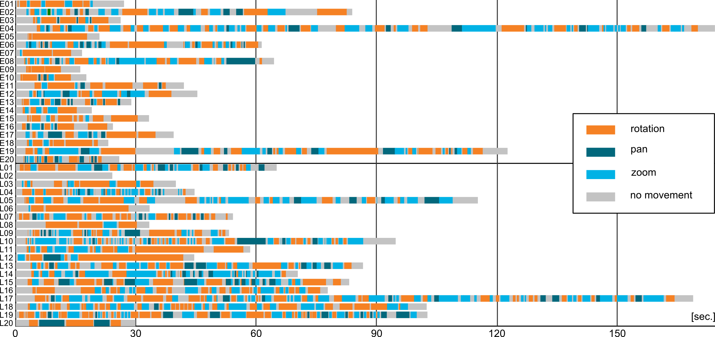 In addition to the spatial component of user interactions, the temporal component can also be studied. The sequences of each type of movement (rotation, pan, zoom) can be compared. This can be done visually with a sequence chart (Figure 3), but comparison is highly subjective and can be challenging (e.g., in case of large numbers of participants, or with complicated sets of interactions). However, we can identify groups of similarly interacting participants: for example, those who prefer rotation (participants E05, E07, E09, L06, and L08) or participants who use all the movement types and take a long time to solve the task (participants E04, E19, and L17). There are no clear differences between expert and layperson groups visible in Figure 3.