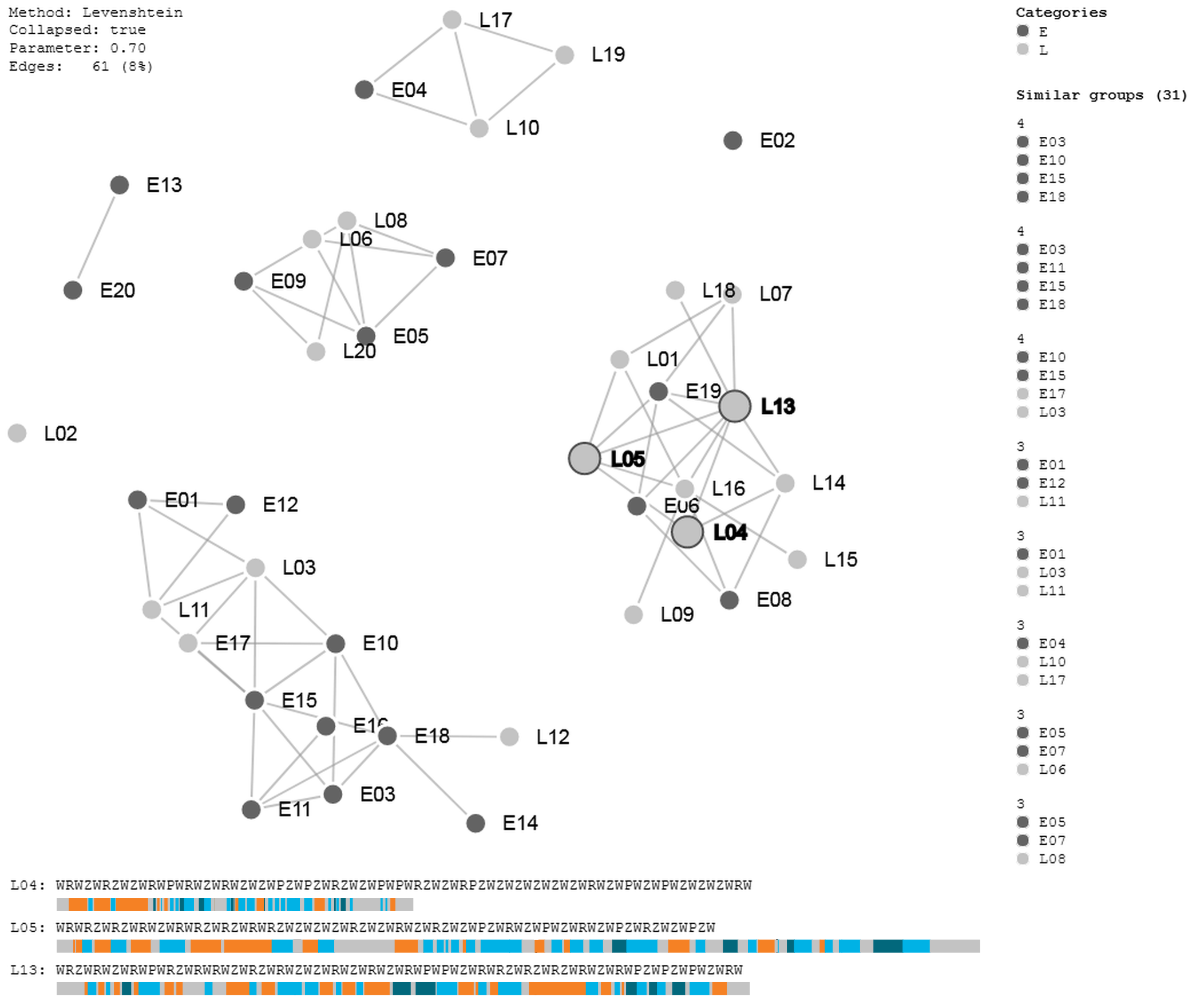 ScanGraph helped to identify the differences between laypersons and experts more quantitatively, but at the same time it created mainly smaller cliques of similar participants (usually with two to five members). Figure 4 shows the 31 calculated cliques; 14 of them are uniform, containing only experts or only laypersons. The various cliques form three larger groups, one with only laypersons, another with only experts, and the third with equal numbers of both participant groups. Two smaller cliques and solitary sequences of participants “E02” and “L02” can also be identified. Participant “L02” solved the problem without any interactions and responded incorrectly (answers A, C, and D).