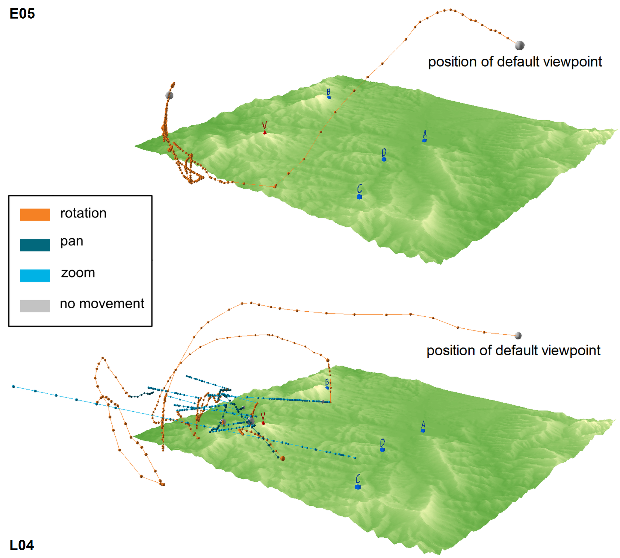 Besides analyzing groups, we can also go into more detail and study the spatial aspects of user interactions performed by individual participants. We can, for instance, visualize individual trajectories, highlighting virtual camera orientation, delays at individual virtual camera positions, or both types of information together. In Figure 5, the symbols for virtual camera positions are colored according to the movement type used (rotation/pan/zoom), which we can see greatly affects the shape of the virtual trajectory.