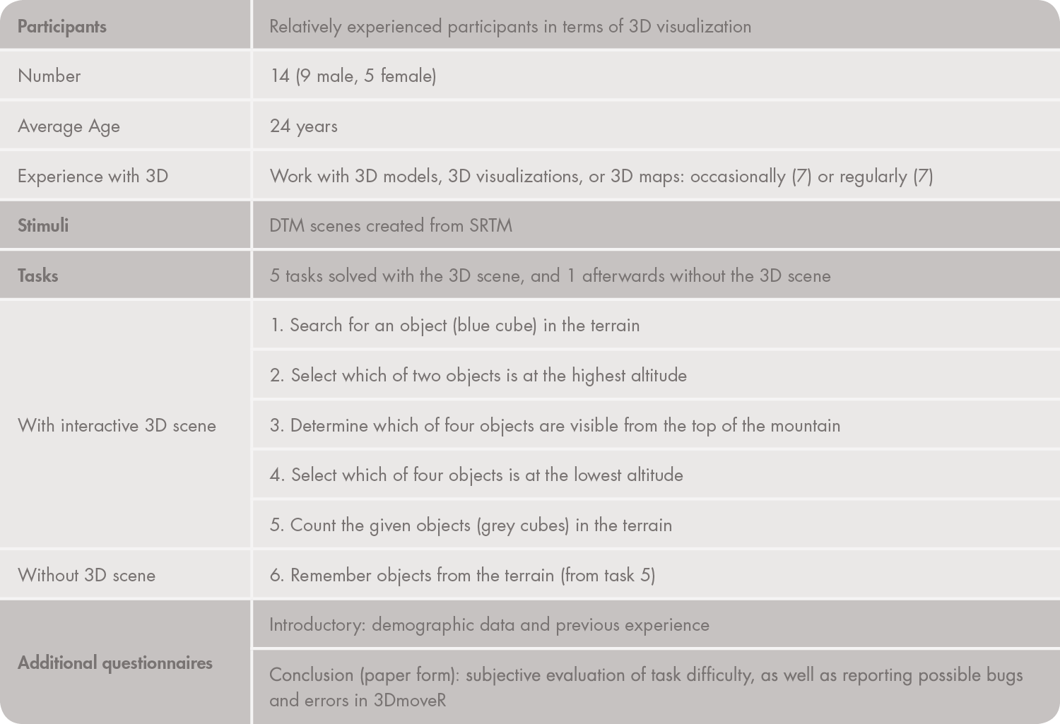 B.1. A questionnaire interface is required, since the testing tool should combine practical tasks (finding solutions to assigned tasks) along with the collecting of subjective responses. A questionnaire may be placed before or after a 3D scene. A questionnaire placed before a scene will likely focus on basic demographic data and previous user experience. A questionnaire can also come after a user solves a task, asking them, for example, to evaluate it, or recall what they remember about the 3D scene. Questionnaires have been used by Schmidt and Delazari (2011), Schobesberger and Patterson (2007), and Preppernau and Jenny (2015), among others.