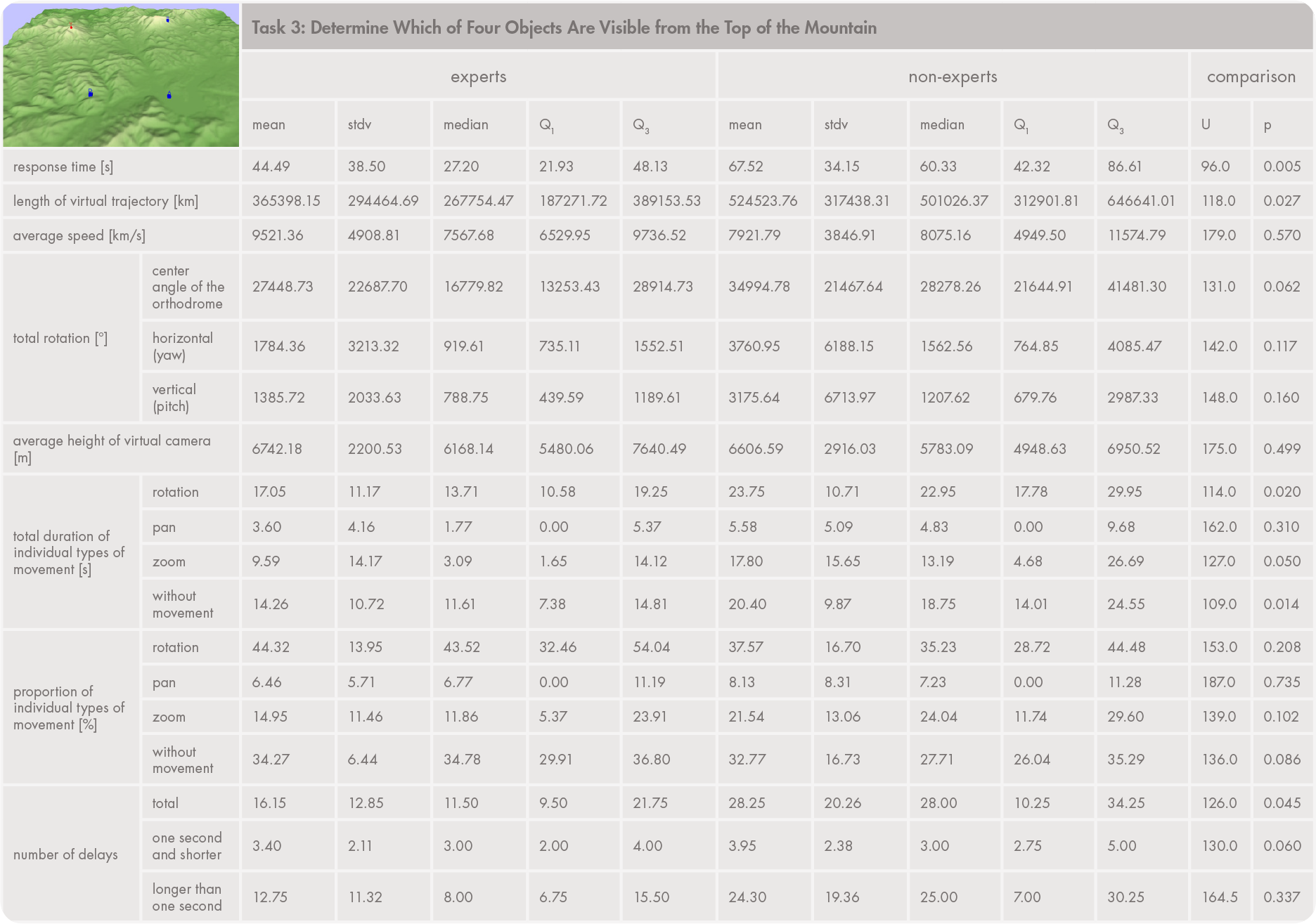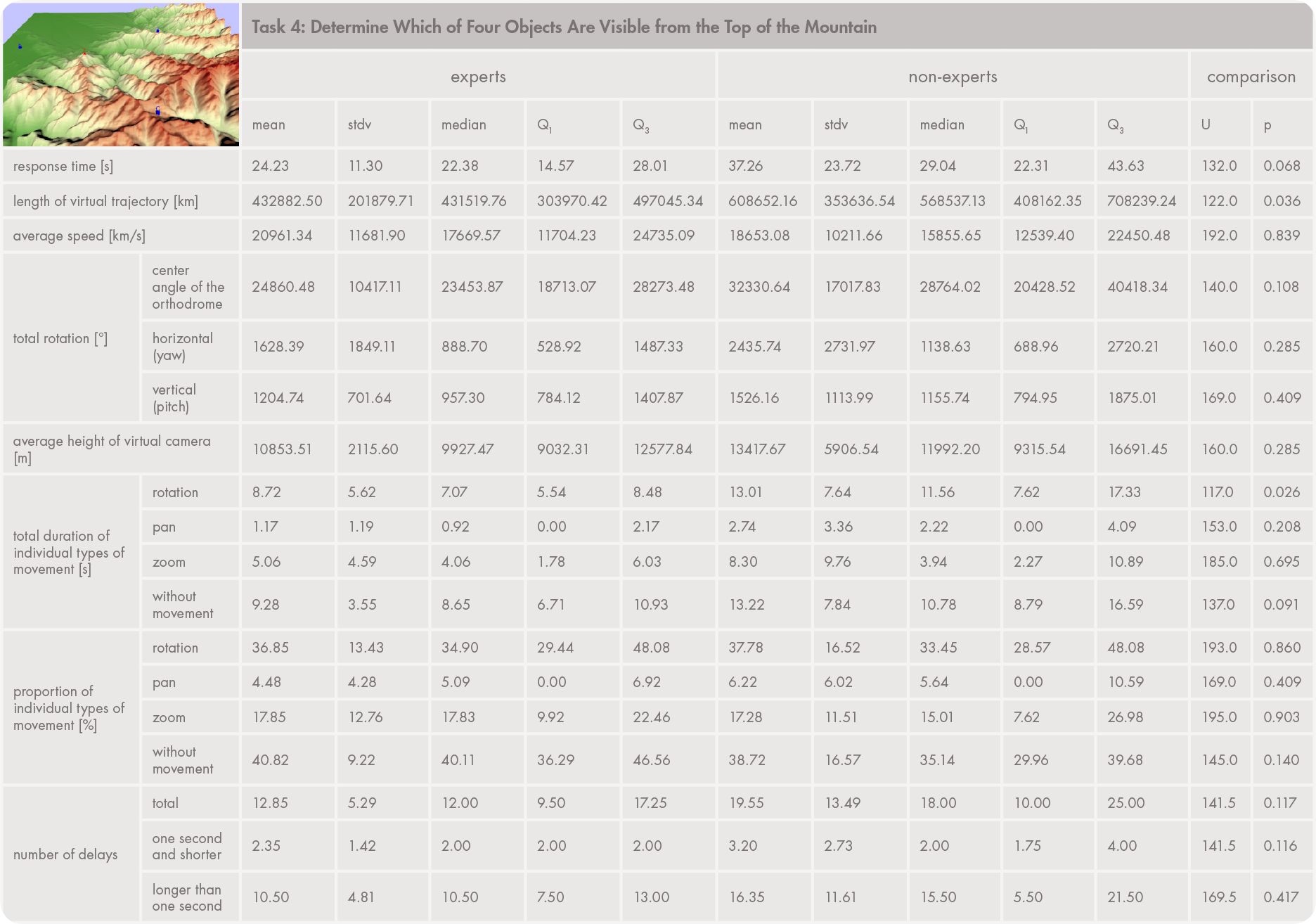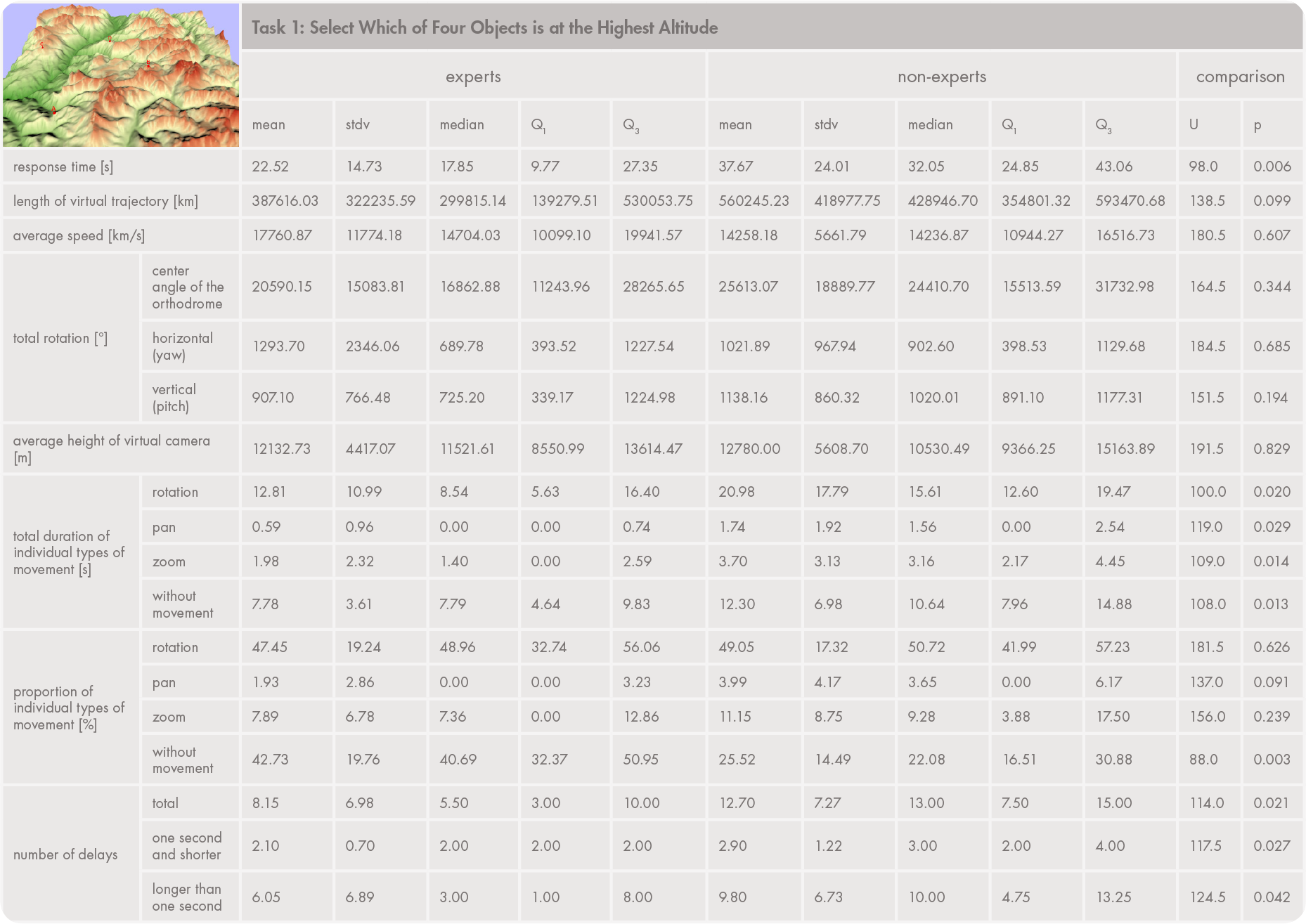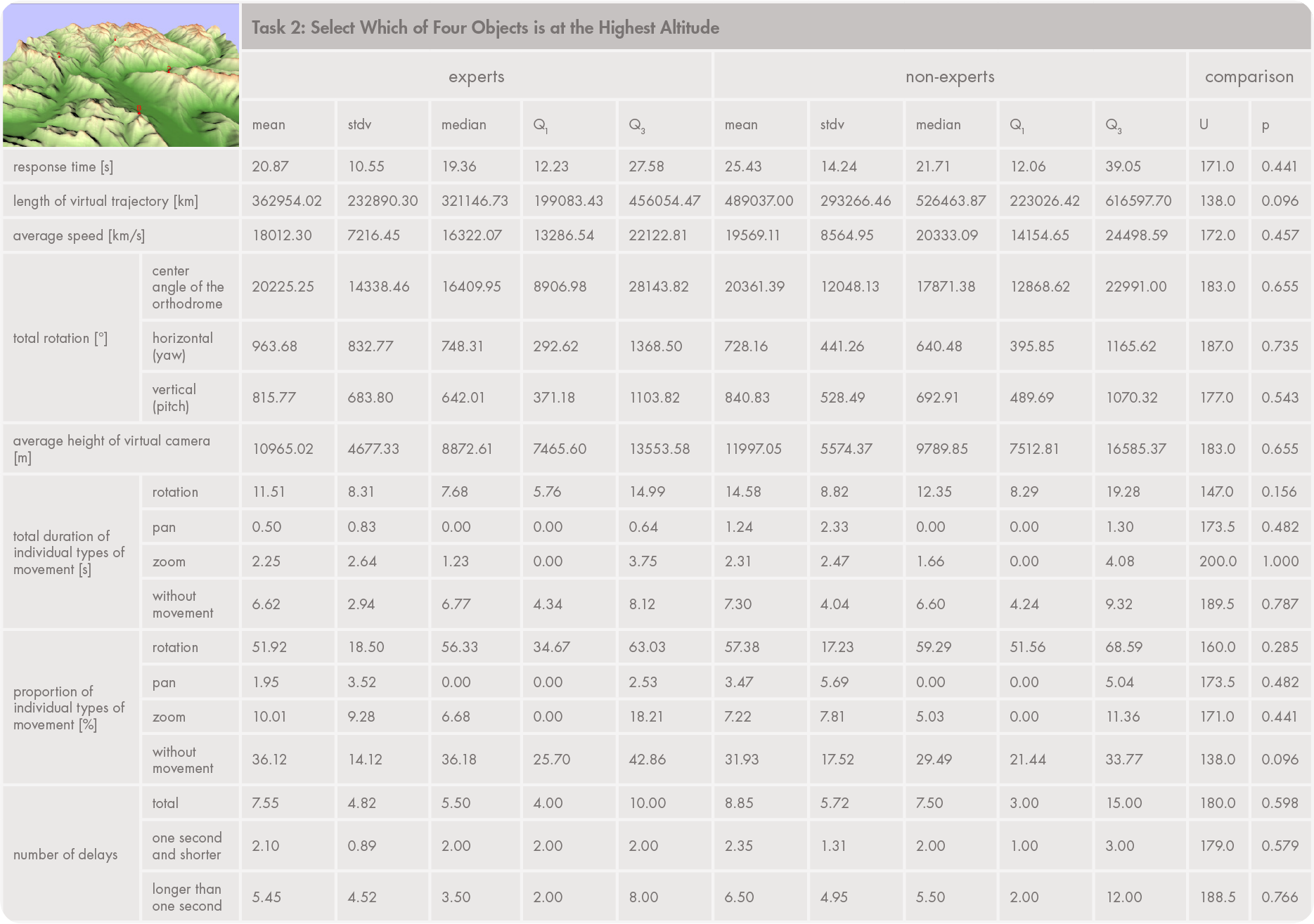 The descriptive statistics presented in Appendix 3 were used to compare response times, virtual movements, and interaction strategies between two user groups (experts and laypersons). Similar approaches have been used or recommended by Bade, Ritter, and Preim (2005); Zanbaka et al., (2005); Wilkening and Fabrikant (2013); and McKenzie and Klippel (2016). Measures were calculated from each user’s virtual trajectory (length, average speed) and virtual camera positions (average height, rotation characteristics), or determined from the duration of individual movement types. We also recorded the moments when interactions were interrupted (delays). Delays longer than one second normally occur at the beginning of a task and just before responding. Shorter delays represent partial interruptions in movements; we assessed movement without interruption as being smoother.