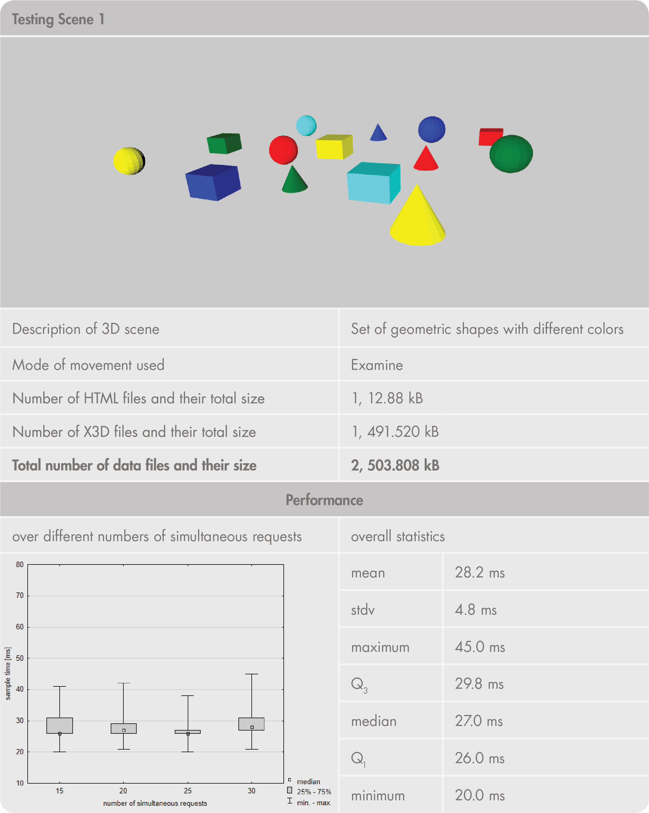 In term of non-functional requirements, the results of our pilot tests (Appendix 1) showed that the application can be considered user friendly (I.1). Users did not report any major problems when using the tool. Although full functionality is only available in Google Chrome, we considered the testing tool to be sufficient in terms of the accessibility (II.1). Ongoing work will aim to support other web browsers. The testing tool was also verified as customizable: each component of the X3D family standards can be used to expand or modify it (II.2–4). Appendix 2 shows different types of 3D data that can be tested in this tool. We also verified that the application’s performance (III.1) and capacity (III.2) met the non-functional requirements (results are also presented in Appendix 2). In terms of availability (III.3), no problems were identified, as the application is not intended for high availability (e.g., hundreds of concurrent users).