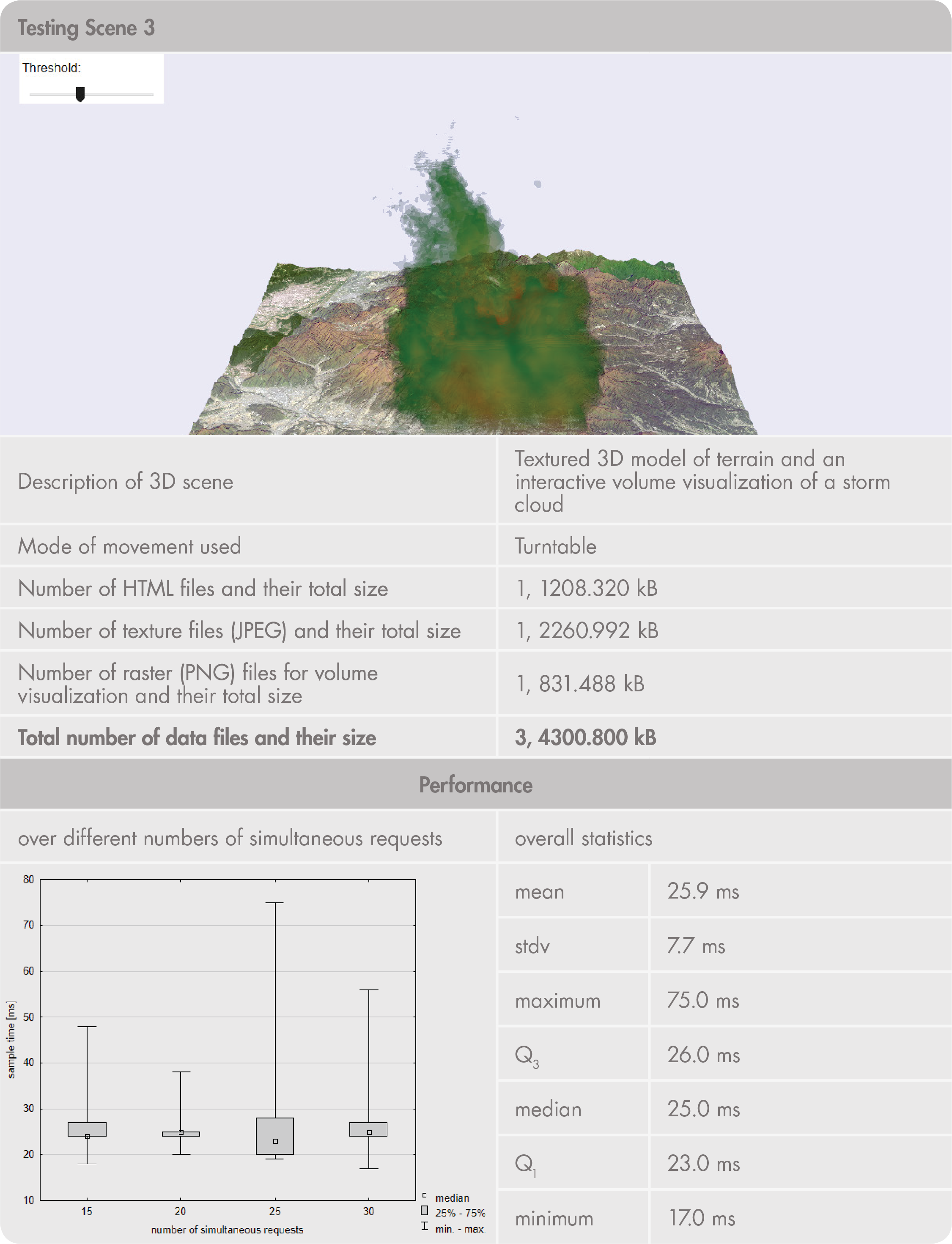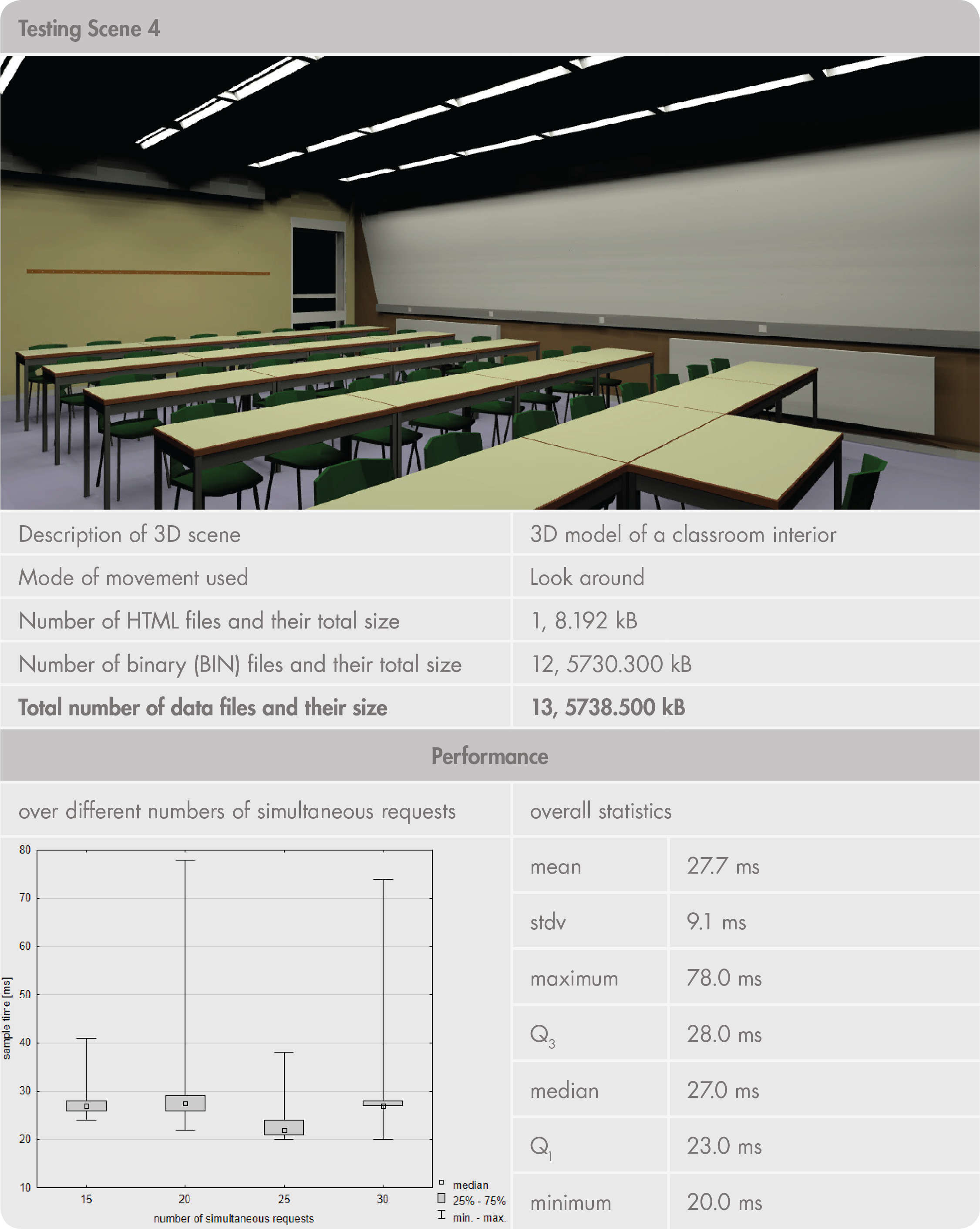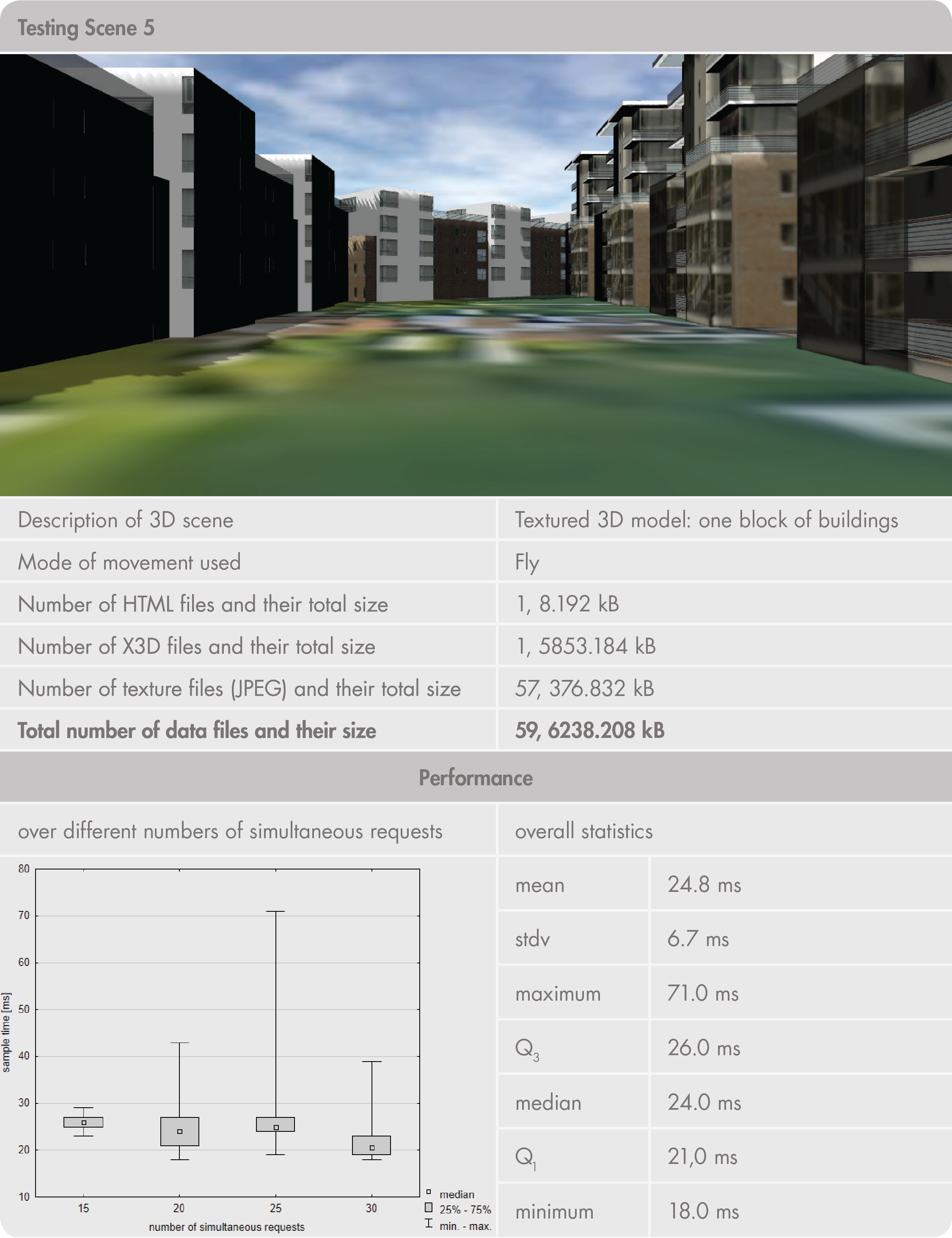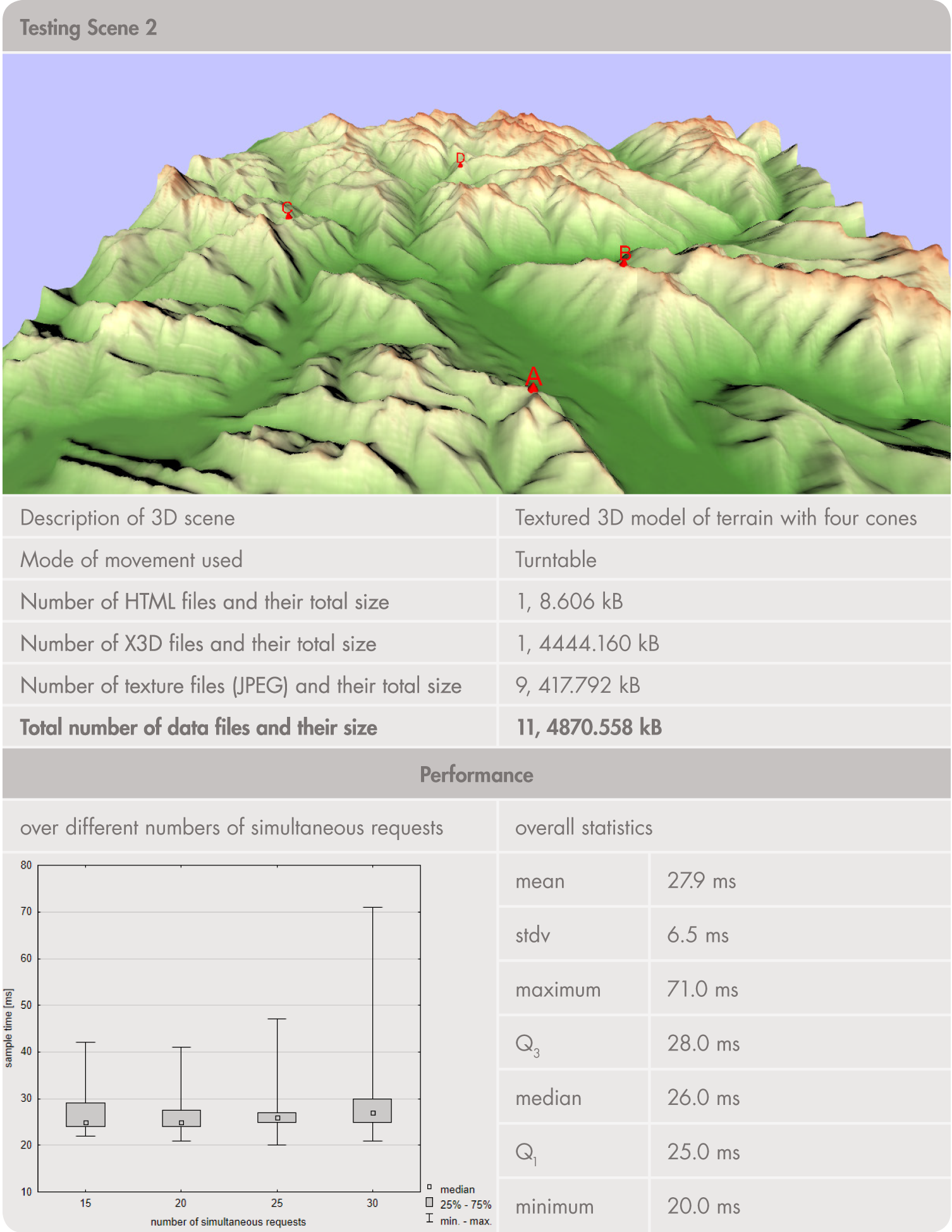 III.1. Performance (speed of responses) states how fast the application can complete a request delivered to it. An efficient response time should guarantee at least a 1 Mbps data transfer rate when loading a new 3D scene. We expect 3D model visualizations in sizes up to 15 MB, so expected performance is within 15 seconds. Loading new data and continuous rendering of a 3D scene (i.e., during virtual movement) should also be fast enough. For that reason, technologies with hardware-accelerated rendering are preferred.